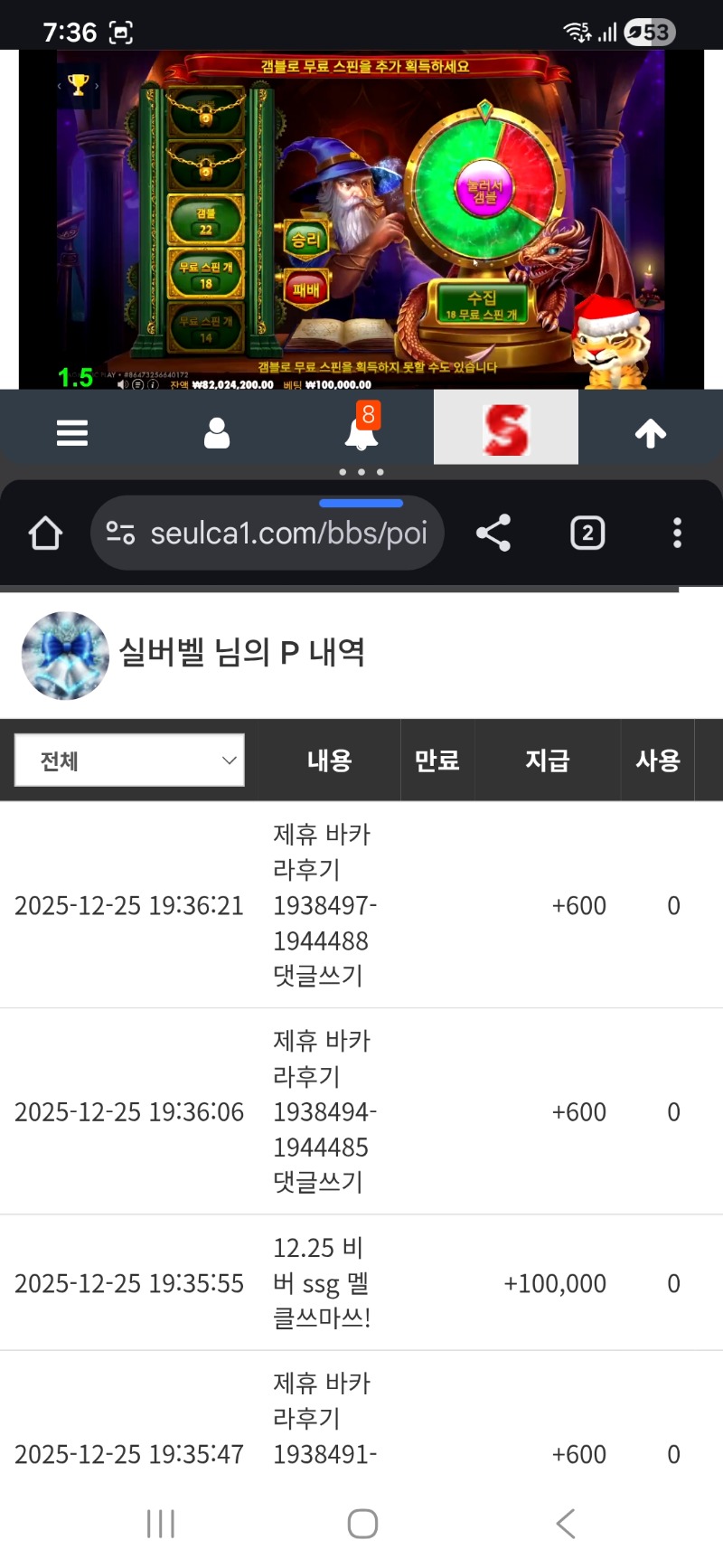 비버의 크리스마스 선물ㅎㅎ 실버벨 7 1 0 19:37:43 *기프티콘 바코드 노출 주의* <- 비버 고마워 메리크리스마스 ~~~~ 1 0 https://seulca1.com/bbs/board.php?bo_table=free&wr_id=3416895 Author 10 7 Lv.18 실버벨 18 135,232,423 (58%) 실버벨님 보유 포인트 : P 2,760,818 +1 12.25 오랜만에 형난 포인트베팅~~~ +2 12.25 펭이 포인트 고마워~~~ +7 12.25 비버의 크리스마스 선물ㅎㅎ +5 12.25 선배팀 가짱~~~ +5 12.25 이거보세요ㅎㅎ 이거 개꿀ㅋㅋ