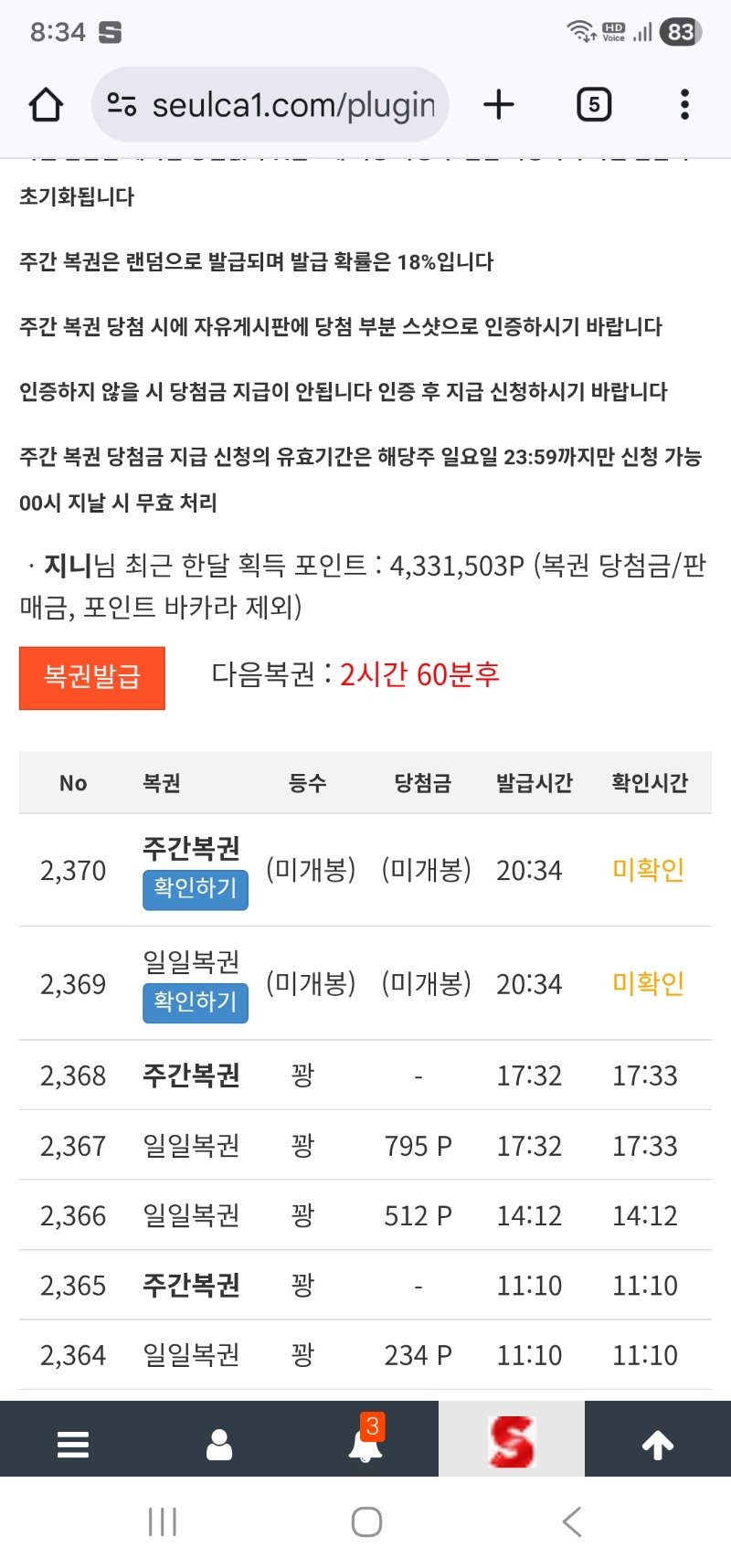 오늘 세번째 쌍복이!!! 지니 1 0 0 20:35:10 *기프티콘 바코드 노출 주의* <- 0 0 https://seulca1.com/bbs/board.php?bo_table=free&wr_id=3417149 Author 4 2 Lv.15 지니 15 38,948,336 (44%) 지니님 보유 포인트 : P 2,134,308 +1 12.25 오늘 세번째 쌍복이!!! 12.25 슬카라,용호 싹털리다 간신히 연승~ 12.25 형난 참가비 납부 12.25 펭아 고마워 ~~ +2 12.25 밤되니 엄청 춥네요!!