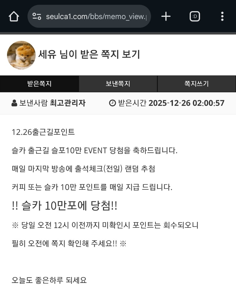 출근길 슬포 당촘 세유 6 0 0 06:04:34 *기프티콘 바코드 노출 주의* <- 자고 일어났더니 포인트가~ 감사합니다~ 0 0 https://seulca1.com/bbs/board.php?bo_table=free&wr_id=3418054 Author 16 7 Lv.12 세유 12 14,582,637 (31%) 세유님 보유 포인트 : P 8,340,479 +6 12.26 출근길 슬포 당촘 +4 12.23 크리스마스 쿠키 완성! +4 12.23 리링쟈기 미리 생축행~ +1 12.21 일복 10등 당촘 +11 12.21 잰아~ 빵 파티다~~~