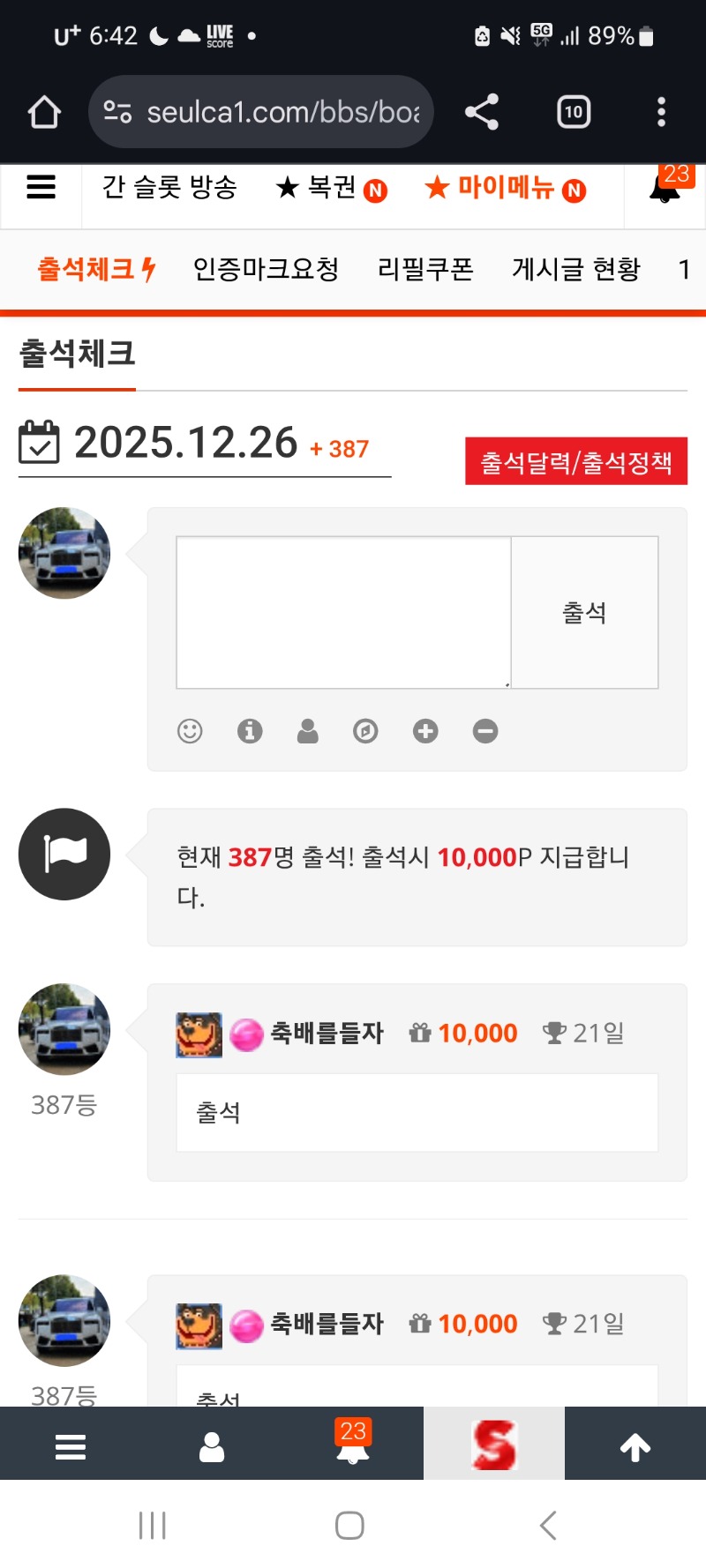 출석합니다 축배를들자 0 0 0 07:06:41 *기프티콘 바코드 노출 주의* <- 출석 0 0 https://seulca1.com/bbs/board.php?bo_table=free&wr_id=3418108 Author 1 0 Lv.9 축배를들자 9 7,348,548 (83%) 축배를들자님 보유 포인트 : P 1,948,889 12.26 우와~~ 미친날씨 +4 12.26 건담 4742배 +16 12.26 뱀피 678배 +6 12.26 멀린 368배 +3 12.26 굿모닝입니다