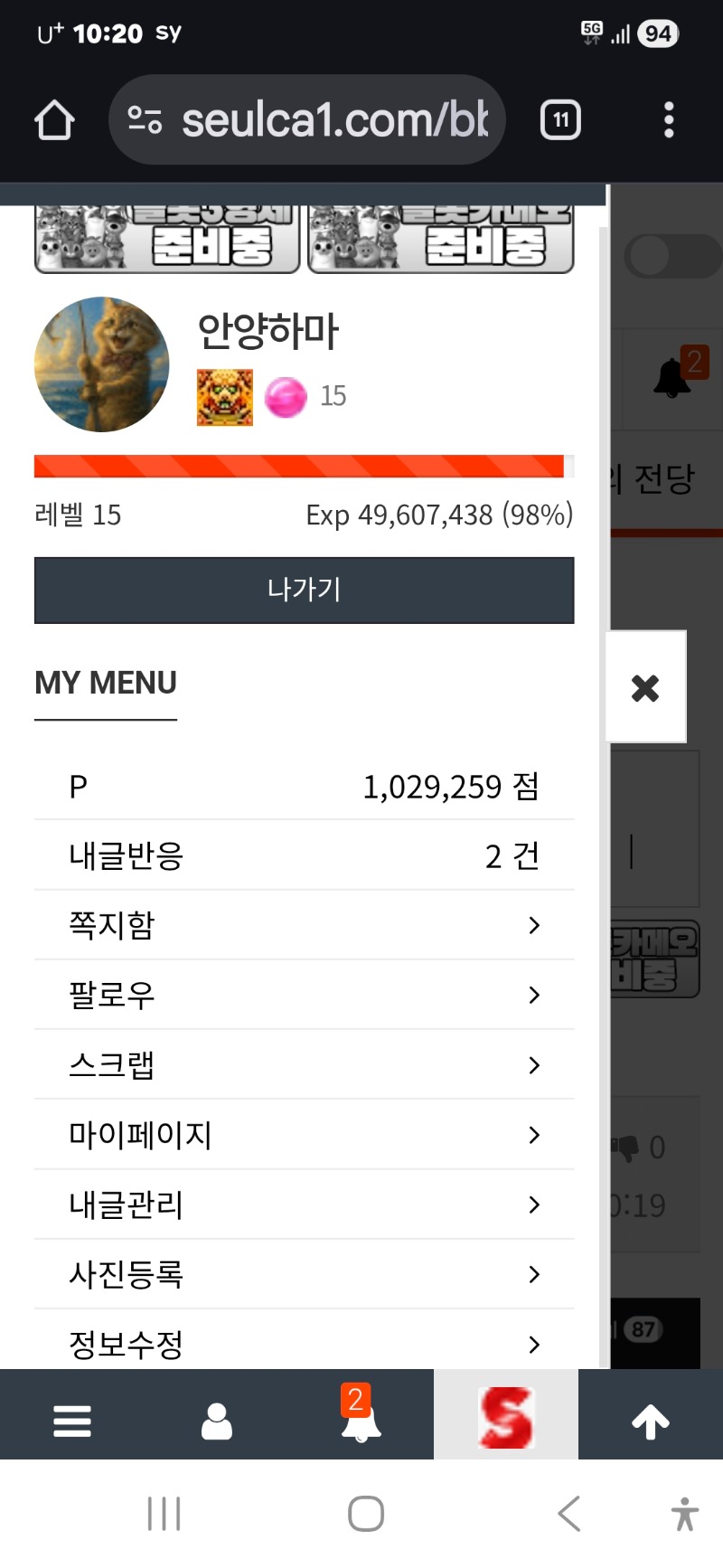 2%부족 레벨 업 안양하마 5 0 0 10:21:40 *기프티콘 바코드 노출 주의* <- 올해안에 업하자 0 0 https://seulca1.com/bbs/board.php?bo_table=free&wr_id=3422122 Author 3 1 Lv.15 안양하마 15 49,628,638 (98%) 안양하마님 보유 포인트 : P 1,051,950 +5 12.27 2%부족 레벨 업 +6 12.27 모닝커피 +8 12.27 출첵 +8 12.27 굿모닝입니다 12.26 굿밤되세요