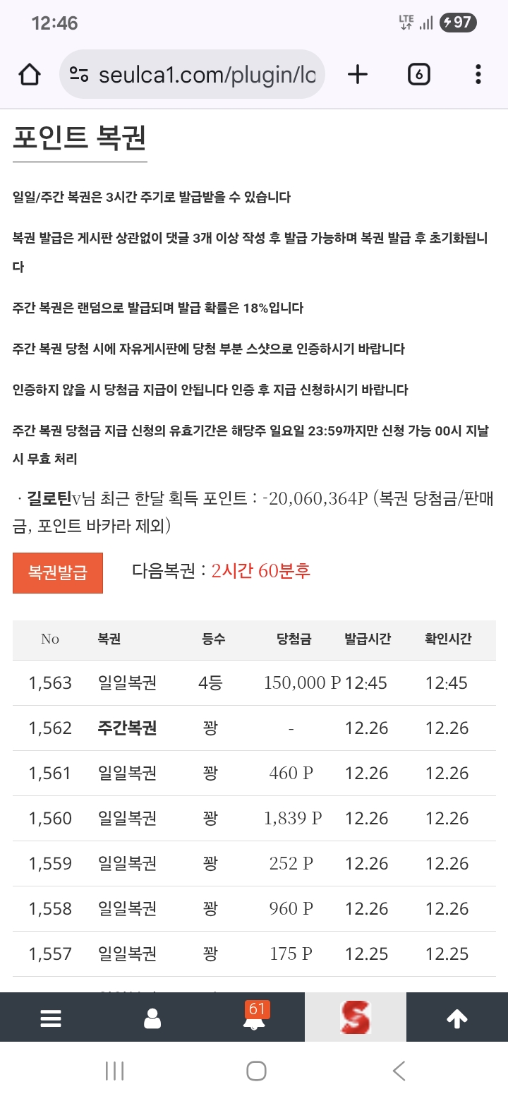 일복 4등 당첨 길로틴v 6 0 0 12:47:04 *기프티콘 바코드 노출 주의* <- 0 0 https://seulca1.com/bbs/board.php?bo_table=free&wr_id=3422680 Author 8 1 Lv.11 길로틴v 11 12,171,061 (72%) 길로틴v님 보유 포인트 : P 13,360,147 +6 12.27 일복 4등 당첨 +1 12.26 펭님 키링 겟 +1 12.26 수익왕 7800온 +3 12.26 한파 진짜 겨울 같네요 +25 12.25 뱅커 강승부 뒷발 ㅅㅅ