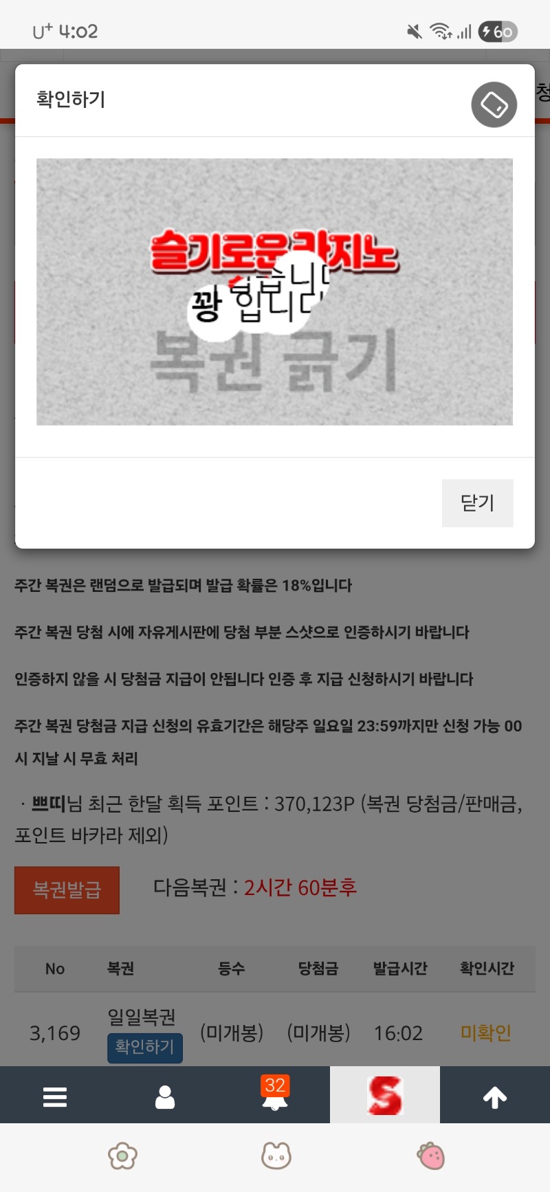 오후 복권 역시나 쁘띠 4 0 0 16:03:12 *기프티콘 바코드 노출 주의* <- 0 0 https://seulca1.com/bbs/board.php?bo_table=free&wr_id=3423400 Author 15 4 Lv.17 쁘띠 17 72,591,919 (8%) 쁘띠님 보유 포인트 : P 1,500,337 +4 12.27 오후 복권 역시나 +6 12.27 슬포150만 +3 12.27 점심 복권 꽝 +1 12.27 아침 복권 꽝 +3 12.27 출첵