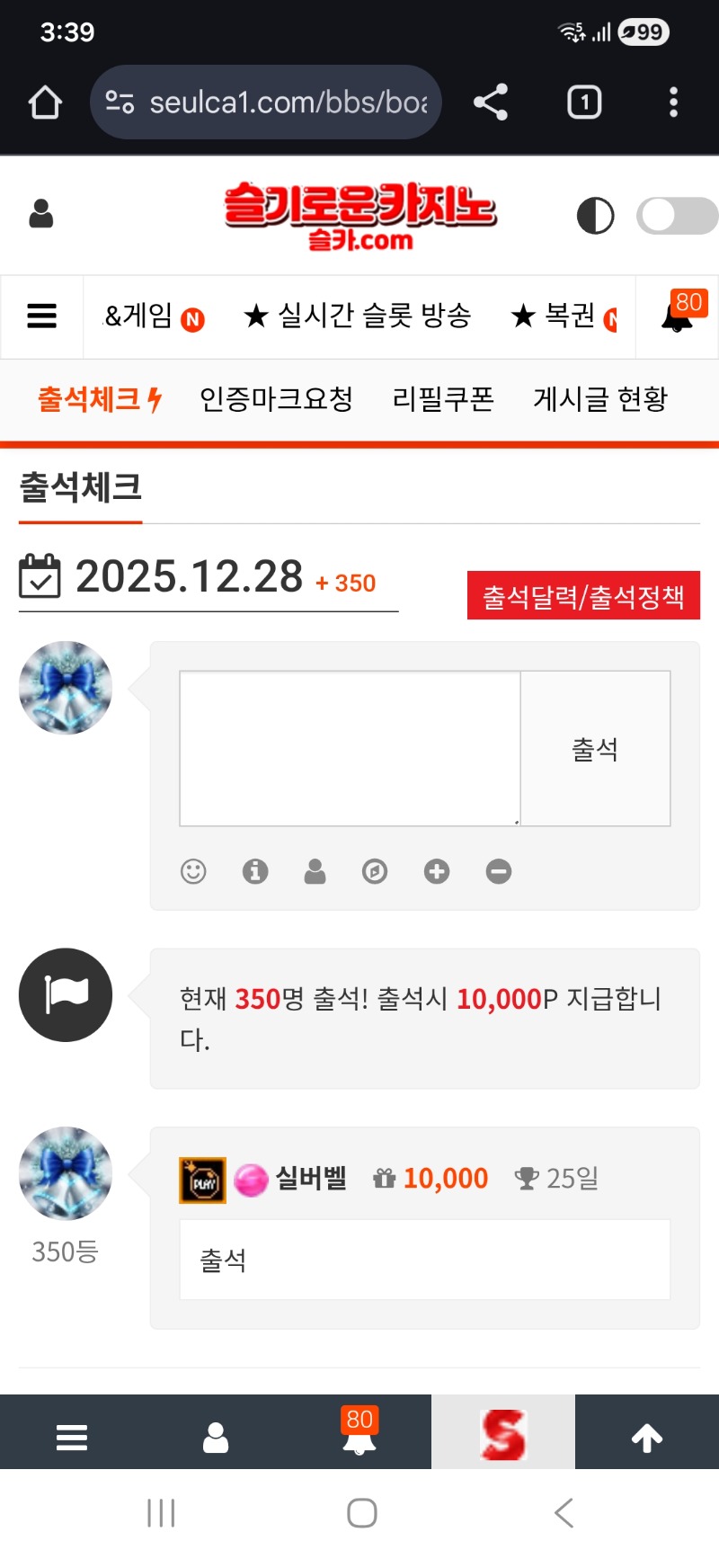 출석하고 ~~ 실버벨 5 1 0 03:40:15 *기프티콘 바코드 노출 주의* <- 1 0 https://seulca1.com/bbs/board.php?bo_table=free&wr_id=3426002 Author 10 7 Lv.18 실버벨 18 136,907,130 (61%) 실버벨님 보유 포인트 : P 145,185 +1 12.28 복권긁고 다시자야지~~ +3 12.28 어렵네 어려워~~~ㅎㅎ +3 12.28 우째해야 당첨되지... +3 12.28 메가볼 가짱~~ +5 12.28 출석하고 ~~