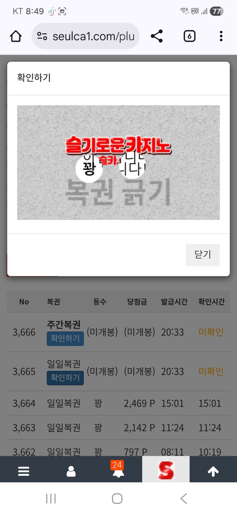 역시 복권운은 없네 ㅠ 지킴이 0 0 0 21:13:48 *기프티콘 바코드 노출 주의* <- 0 0 https://seulca1.com/bbs/board.php?bo_table=free&wr_id=3429893 Author 9 4 Lv.18 지킴이 18 132,983,077 (54%) 지킴이님 보유 포인트 : P 868,188 12.28 역시 복권운은 없네 ㅠ +3 12.28 이번주 마지막복귄은 .쌍복이 +2 12.28 맛저 하세요 +3 12.28 오후복권은..꽝 +14 12.28 점심은 너로 정했다~~