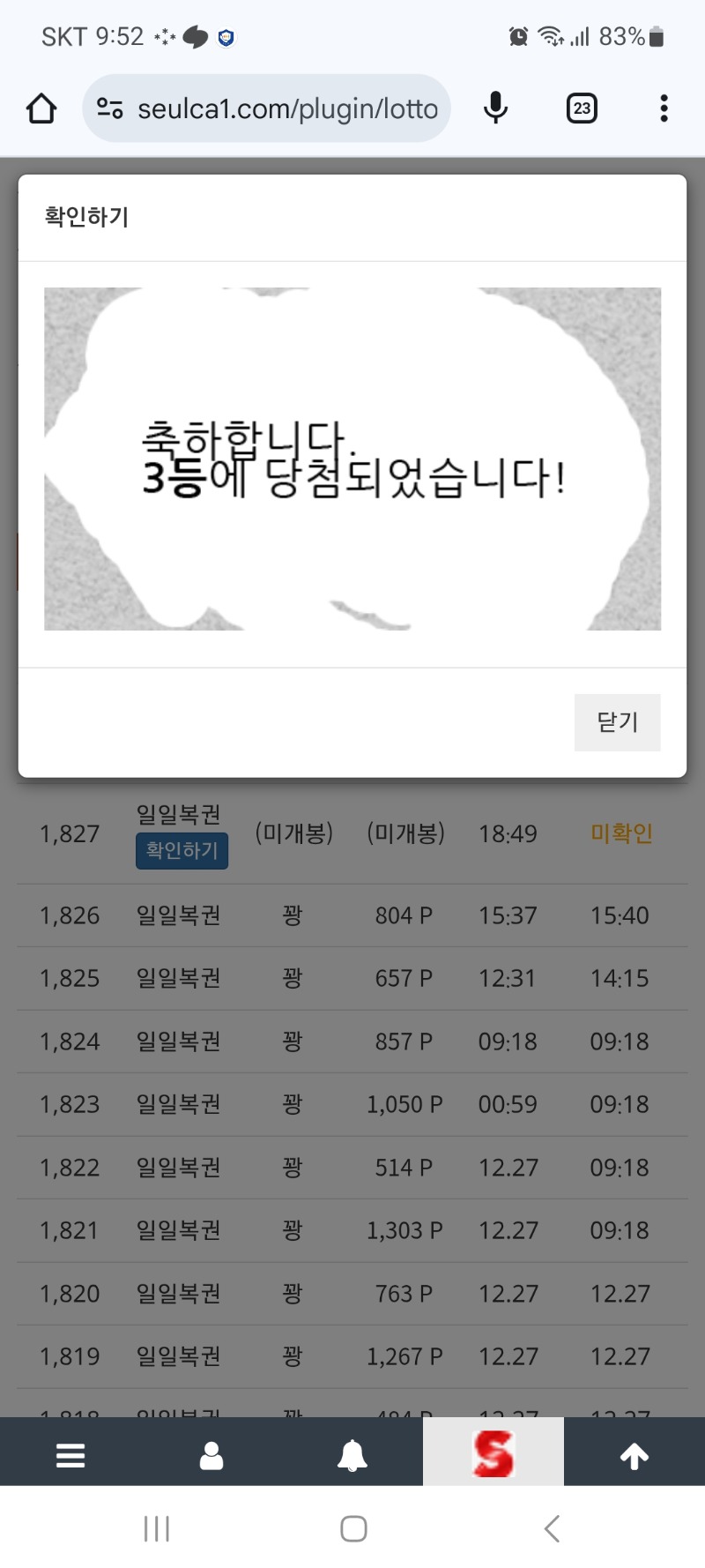 일복3등~~ 나이스입니다 렌슬롯 7 1 0 21:58:59 *기프티콘 바코드 노출 주의* <- 1 0 https://seulca1.com/bbs/board.php?bo_table=free&wr_id=3430067 Author 1 2 Lv.10 렌슬롯 10 9,630,926 (81%) 렌슬롯님 보유 포인트 : P 1,471,088 +7 12.28 일복3등~~ 나이스입니다 +1 12.28 밥먹고합시다 ~~ +1 12.28 [비밀글] 포교신청 +5 12.28 밥먹고합시다 12.27 출책합니다