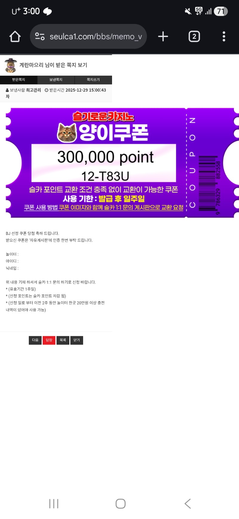 양아부지 추겜&양쿱! 계란마으리 4 0 0 15:57:17 *기프티콘 바코드 노출 주의* <- 나홀로 님이 양도해주신 ㅋㅋㅋ양쿱 ♡ 감사히 잘쓰겟슴다우!!!!!! 0 0 https://seulca1.com/bbs/board.php?bo_table=free&wr_id=3433383 Author 14 5 Lv.15 계란마으리 15 31,696,665 (8%) 계란마으리님 보유 포인트 : P 660,900 +4 12.29 양아부지 추겜&양쿱! +16 12.29 물개 추겜 수익 슈우우웃!!! +19 12.28 ㅋㅋㅋㅋ아놔 최대의실수.. +10 12.28 산타양아부지 ㅜㅜㅠ +38 12.28 아이고 형제들도 고생이네ㅜㅜ