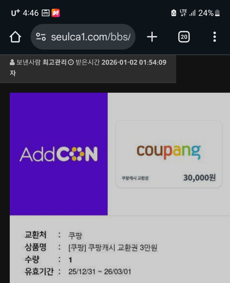랜덤쿠폰 쿠팡캐시교환권 사라진머니 4 0 0 01.02 05:08 *기프티콘 바코드 노출 주의* <- 0 0 https://seulca1.com/bbs/board.php?bo_table=free&wr_id=3449036 Author 0 0 Lv.5 사라진머니 5 436,243 (6%) 사라진머니님 보유 포인트 : P 549,086 +2 01.18 랑이 수익기념 커피 감사합니다 +3 01.16 출근길 포인트 감사합니다 +1 01.14 최배비 1,2등 적중 감사합니다 +4 01.02 랜덤쿠폰 쿠팡캐시교환권 +1 01.02 [비밀글] 랜덤쿠폰 교환