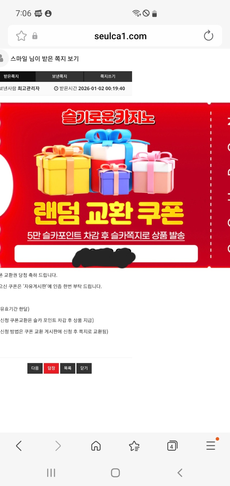 랜던쿠폰당첨 스마일 2 0 0 01.02 07:10 *기프티콘 바코드 노출 주의* <- 0 0 https://seulca1.com/bbs/board.php?bo_table=free&wr_id=3449250 Author 0 0 Lv.6 스마일 6 1,436,680 (43%) 스마일님 보유 포인트 : P 837,712 +11 01.21 카지노로얄 맥윈 +4 01.04 황달님 ㄱㅅㄱㅅ +1 01.04 [비밀글] 감사합니당 +2 01.02 랜던쿠폰당첨 +1 01.02 [비밀글] 감사합니다