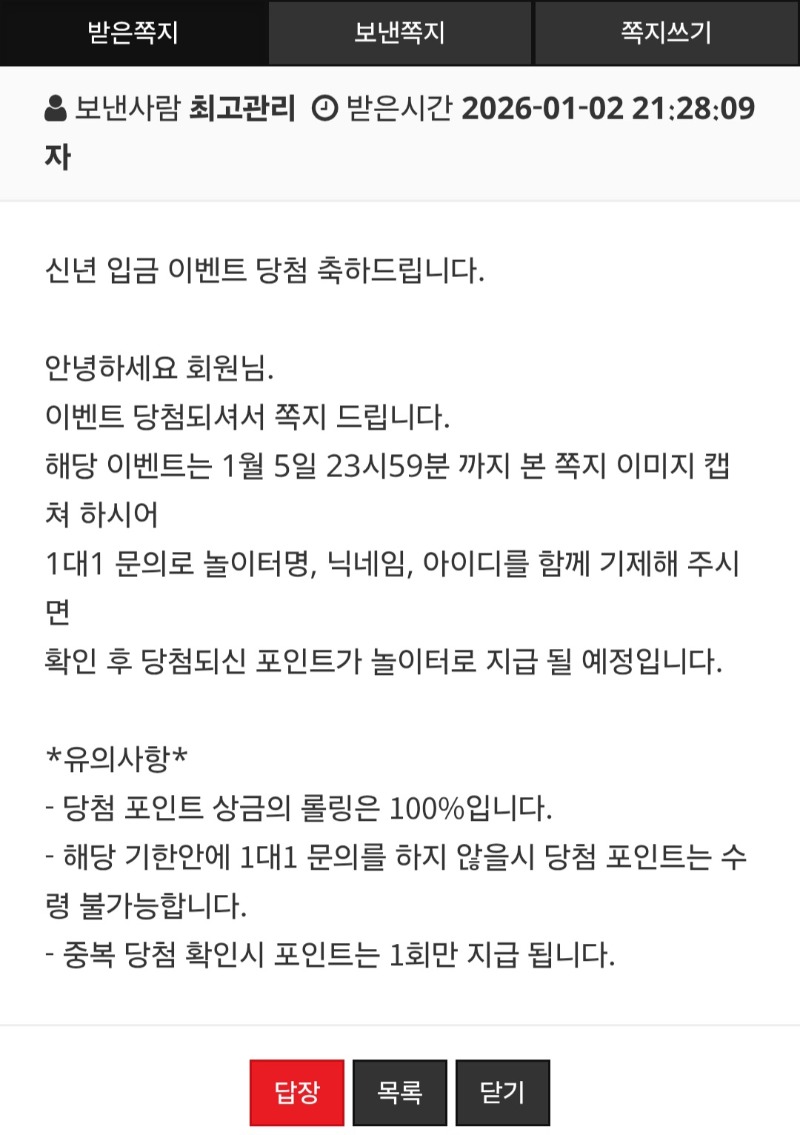 신년 입금 이벤트 당첨 감사합니다 !! 참사장 1 0 0 01.02 21:59 *기프티콘 바코드 노출 주의* <- 감사합니다 잘쓰겟습니다 ㅎㅎ 슬카 형님 누님들 새해복 많이 받으시고 행복한 한해 되길 바랍니다 ^^! 0 0 https://seulca1.com/bbs/board.php?bo_table=free&wr_id=3452045 Author 0 0 Lv.3 참사장 3 90,894 (81%) 참사장님 보유 포인트 : P 379,362 +1 01.08 굿모닝입니다 +1 01.02 신년 입금 이벤트 당첨 감사합니다 !!