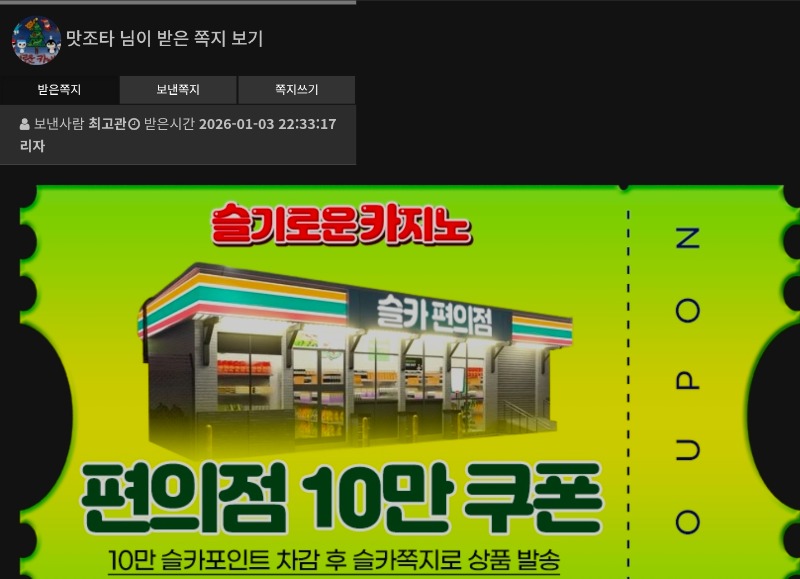 달이 수익기념쿱 감사합니다 맛조타 2 0 0 01.03 23:29 *기프티콘 바코드 노출 주의* <- 0 0 https://seulca1.com/bbs/board.php?bo_table=free&wr_id=3455409 Author 0 0 Lv.5 맛조타 5 919,144 (86%) 맛조타님 보유 포인트 : P 3,023,405 +13 01.18 달이가 쏜다 식사 이벤트 +1 01.17 [비밀글] 달이 배민쿱 +1 01.17 [비밀글] 달이 배민쿱 +1 01.03 [비밀글] 달이수익기념쿠폰 +2 01.03 달이 수익기념쿱 감사합니다