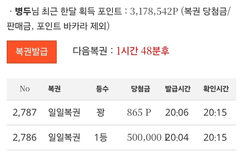 구매복권 1등 슈웃~ 병두 13 2 0 01.11 20:35 *기프티콘 바코드 노출 주의* <- 킹팰릭스님 감사합니다~~! 2 0 https://seulca1.com/bbs/board.php?bo_table=free&wr_id=3478137 Author 2 0 Lv.12 병두 12 14,227,749 (24%) 병두님 보유 포인트 : P 62,756 +3 01.19 차 한잔의 여유~ +15 01.16 일복 1등 슈웃~ +3 01.13 저메추 +13 01.11 구매복권 1등 슈웃~ 01.06 오늘도 출석쳌~
