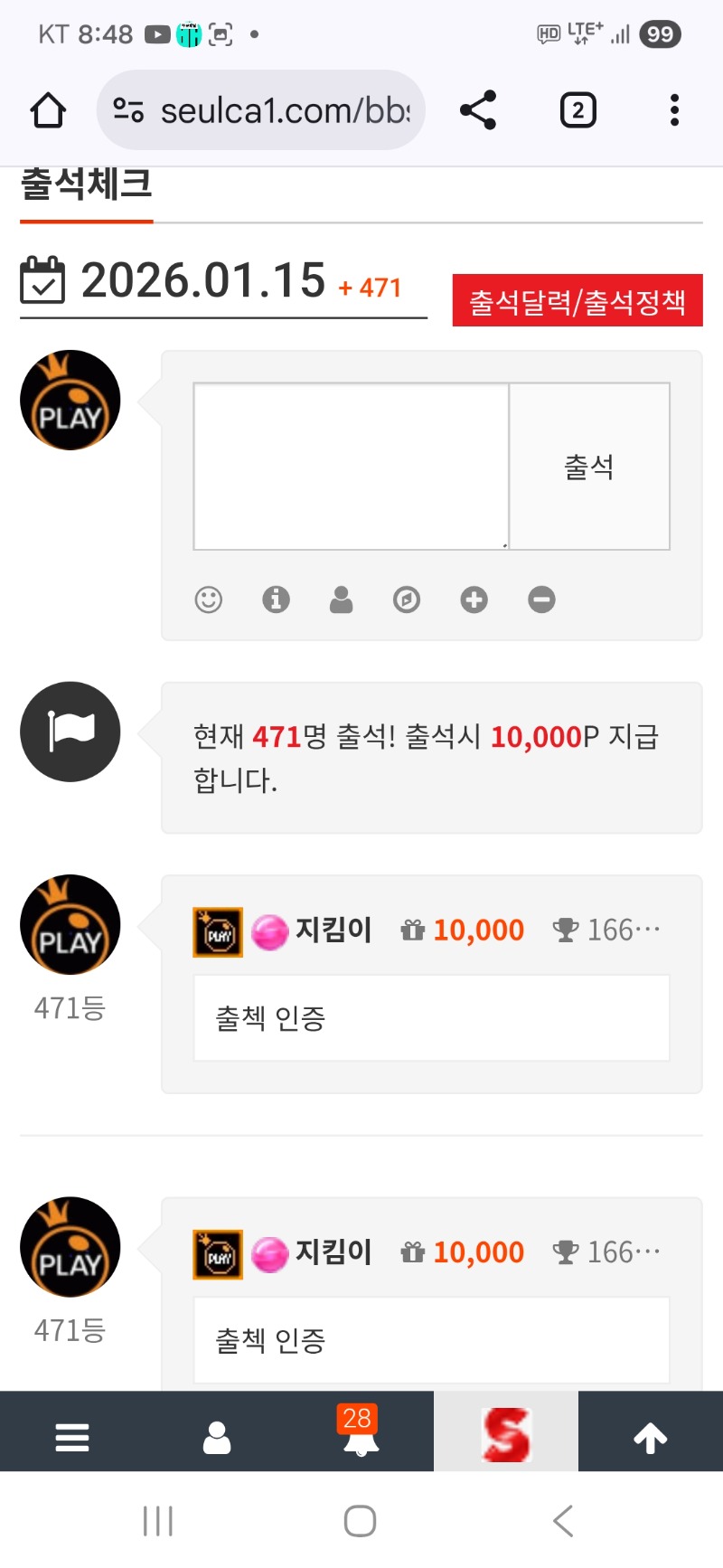 출첵 인증 지킴이 1 0 0 08:53:36 *기프티콘 바코드 노출 주의* <- 만근 가보자구요 ^^♡ 0 0 https://seulca1.com/bbs/board.php?bo_table=free&wr_id=3487956 Author 9 4 Lv.18 지킴이 18 138,349,705 (63%) 지킴이님 보유 포인트 : P 22,314 +1 01.15 뎅나고 리필영~~ +1 01.15 또 뎅나고 ㅠ 01.15 이모 5만포 주세요 ^^ +1 01.15 출첵 인증 +1 01.15 출근길 커피한잔 ~~