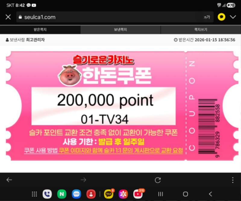 돈부장님 맥스 기원 쿠폰 감사합니다 와니 1 0 0 01.15 20:44 *기프티콘 바코드 노출 주의* <- 0 0 https://seulca1.com/bbs/board.php?bo_table=free&wr_id=3489667 Author 3 1 Lv.10 와니 10 8,223,162 (11%) 와니님 보유 포인트 : P 12,861,438 +4 01.18 최바비 1,2등 적중 배민쿠폰 +1 01.18 [비밀글] 쿠폰교환신청 +1 01.15 돈부장님 맥스 기원 쿠폰 감사합니다 +30 12.31 정근신청입니다