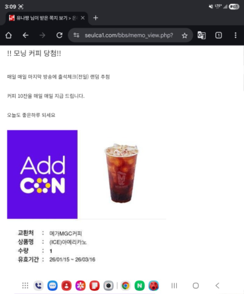 출근길커피당첨 ㄱㅅ 유나짱 6 0 0 01.16 03:10 *기프티콘 바코드 노출 주의* <- 0 0 https://seulca1.com/bbs/board.php?bo_table=free&wr_id=3490421 Author 0 0 Lv.9 유나짱 9 6,856,468 (71%) 유나짱님 보유 포인트 : P 7,631 +2 01.19 굿모닝입니다 +6 01.19 와웨골515 +1 01.19 랑이 수익커피 잘마실께^^ +3 01.16 일복6등 당첨 ㅎㅎ +6 01.16 출근길커피당첨 ㄱㅅ
