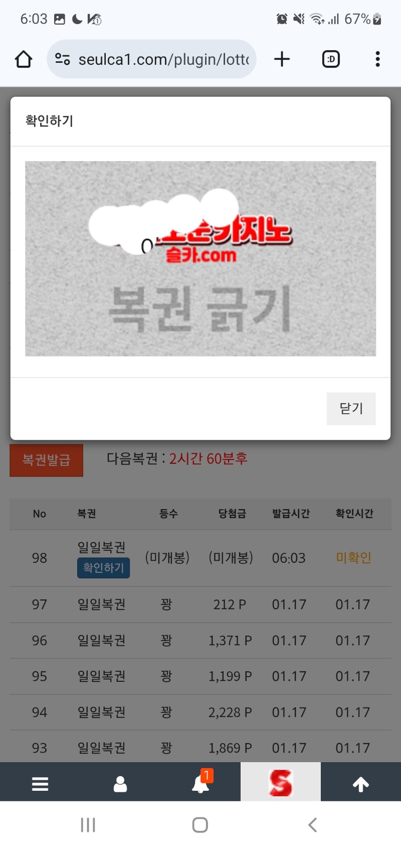 금일 첫복권은 일복인데.. 무조건한방가자 2 0 0 06:06:50 *기프티콘 바코드 노출 주의* <- 이정도면 나머지안까봐도 꽝이겠죠..ㅜ 0 0 https://seulca1.com/bbs/board.php?bo_table=free&wr_id=3495866 Author 0 0 Lv.5 무조건한방가자 5 972,534 (95%) 무조건한방가자님 보유 포인트 : P 75,176 +9 01.18 슬롯초짜라..궁금한것이..맥스라고하는기준이 +2 01.18 금일 첫복권은 일복인데.. 01.18 다시방문요 이모ㅜ +10 01.17 색깔이 빨갱이..이쁘지않나요? 미적중 ? ㅋ +2 01.17 꽝줄이 이어갑니다~