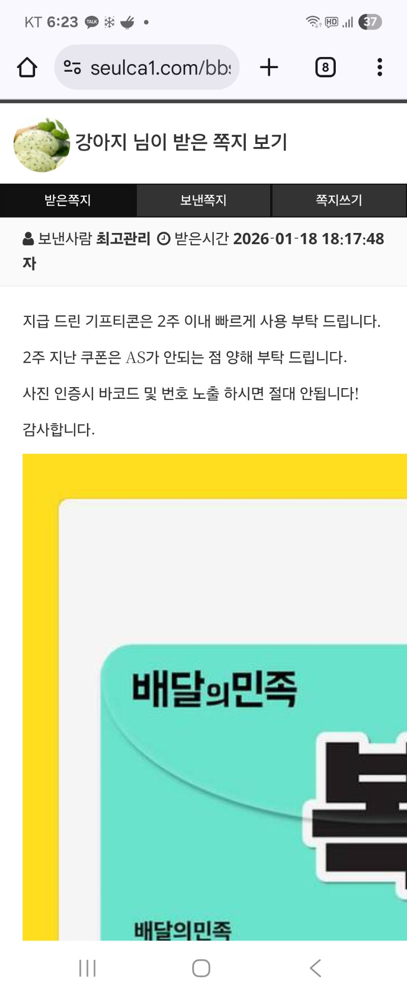 펭이 추겜성공 배민 쿠폰 고마워용 ^^^ 강아지 3 0 0 18:25:42 *기프티콘 바코드 노출 주의* <- 0 0 https://seulca1.com/bbs/board.php?bo_table=free&wr_id=3497172 Author 0 0 Lv.12 강아지 12 17,104,532 (82%) 강아지님 보유 포인트 : P 152,268 +1 01.18 [비밀글] 포인트교환 +9 01.18 펭이 추겜 당첨 포인트 감사합니다 ♡♡♡ +3 01.18 펭이 추겜성공 배민 쿠폰 고마워용 ^^^ +39 01.18 뱀피 579배 +34 01.18 뱀피 752배