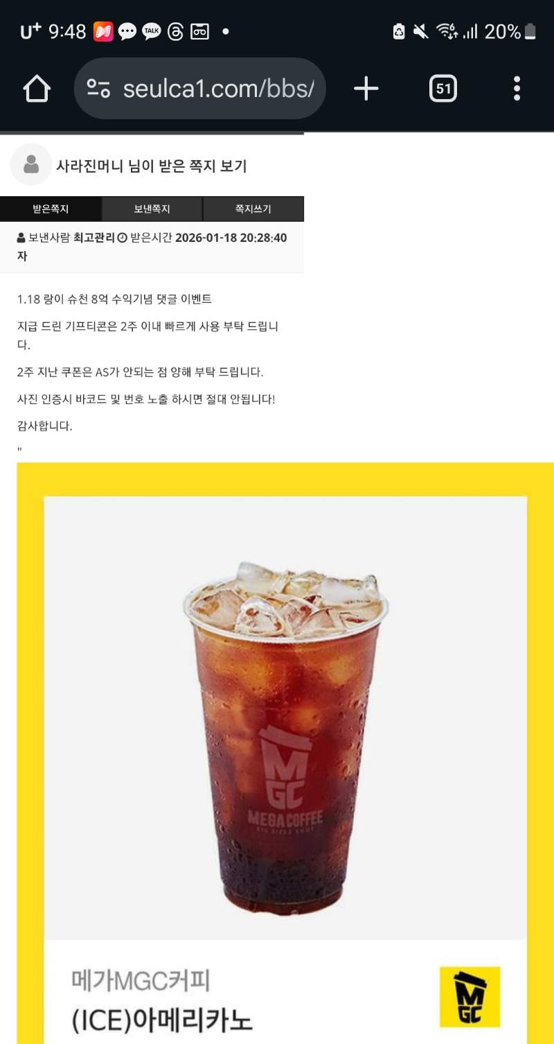 랑이 수익기념 커피 감사합니다 사라진머니 2 0 0 21:49:15 *기프티콘 바코드 노출 주의* <- 0 0 https://seulca1.com/bbs/board.php?bo_table=free&wr_id=3497679 Author 0 0 Lv.5 사라진머니 5 423,805 (3%) 사라진머니님 보유 포인트 : P 536,648 +2 01.18 랑이 수익기념 커피 감사합니다 +3 01.16 출근길 포인트 감사합니다 +1 01.14 최배비 1,2등 적중 감사합니다 +4 01.02 랜덤쿠폰 쿠팡캐시교환권 +1 01.02 [비밀글] 랜덤쿠폰 교환
