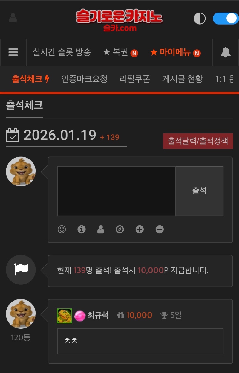 출석체크 갓쨩 최규혁 1 0 0 00:10:52 출석체크!! 0 0 https://seulca1.com/bbs/board.php?bo_table=free&wr_id=3498169 Author 8 4 Lv.12 최규혁 12 13,823,081 (16%) 최규혁님 보유 포인트 : P 3,200 +8 01.19 시안슬롯 가쨔아 +8 01.19 오투 1055배 +5 01.19 뱀피 797배 +6 01.19 뱀피 846배 +1 01.19 포인트가 포교때문에 사라졌네요..