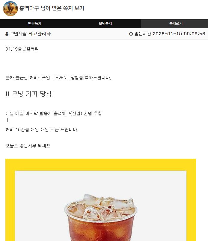 출근길 모닝커피 감사~~~ 홍뼉다구 1 0 0 09:35:53 *기프티콘 바코드 노출 주의* <- 감사합니다~~~^^ 0 0 https://seulca1.com/bbs/board.php?bo_table=free&wr_id=3498983 Author 0 0 Lv.5 홍뼉다구 5 455,278 (9%) 홍뼉다구님 보유 포인트 : P 292,017 +1 01.19 출근길 모닝커피 감사~~~ 01.19 좋은아침이요 +1 01.18 [비밀글] 쿠폰교환이요 +3 01.18 최바비 1,2등 당첨 배민쿠폰 +1 01.17 [비밀글] 포인트교환이요