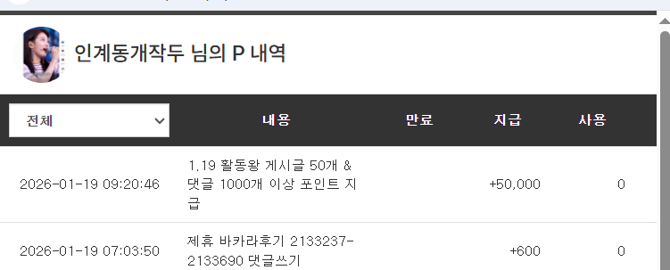 활동 포인트 5만포 감사합니다 인계동개작두 4 0 0 10:14:25 *기프티콘 바코드 노출 주의* <- 처음 받아보는 포인트 감사합니다 0 0 https://seulca1.com/bbs/board.php?bo_table=free&wr_id=3499052 Author 4 0 Lv.14 인계동개작두 14 24,945,160 (27%) 인계동개작두님 보유 포인트 : P 0 +4 01.19 활동 포인트 5만포 감사합니다 +1 01.18 티끌모아 깡치고 최바비 만들었네요 +4 01.18 순대국밥 한그릇 합니다 01.18 굿모닝 입니다 +3 01.18 바카라 뎅나니 슬카라 또 뎅