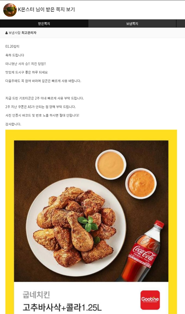 미형사자승 치킨쿠폰 K몬스터 4 1 0 01.20 22:33 *기프티콘 바코드 노출 주의* <- 이얼마만의 당첨이냐 사자야 잘묵으께~~ 1 0 https://seulca1.com/bbs/board.php?bo_table=free&wr_id=3503691 Author 12 3 Lv.15 K몬스터 15 38,461,111 (42%) K몬스터님 보유 포인트 : P 236,272 +4 01.20 미형사자승 치킨쿠폰 +5 01.20 추버도 날은 좋구나~~ +4 01.20 마실나왔는데춥다~~ +12 01.20 meow 메가 119배 +10 01.20 meow 메가 174배