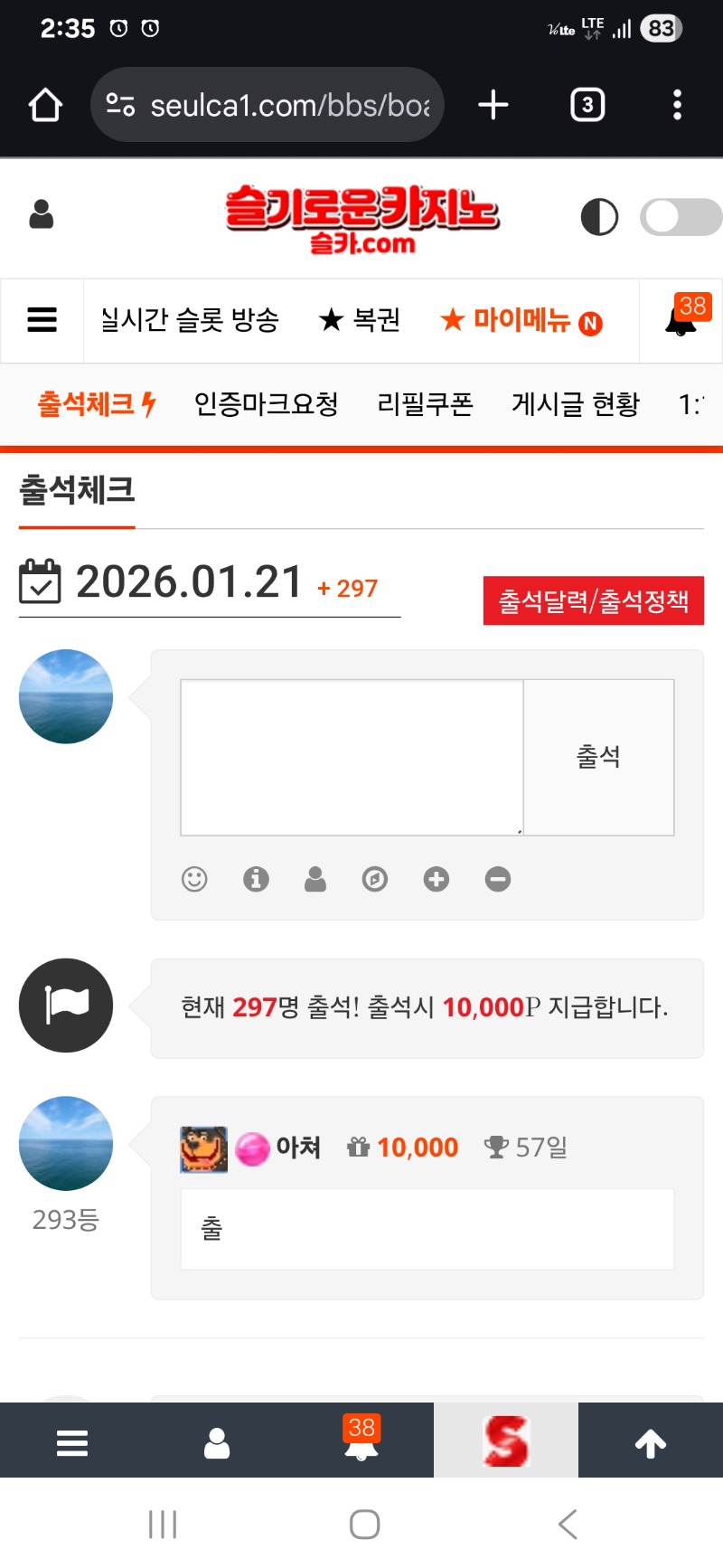 출책 아쳐 1 0 0 02:35:39 *기프티콘 바코드 노출 주의* <- 0 0 https://seulca1.com/bbs/board.php?bo_table=free&wr_id=3504111 Author 1 0 Lv.9 아쳐 9 6,669,059 (66%) 아쳐님 보유 포인트 : P 15,257 +1 01.21 출책 +1 01.20 언제까지 꽝만줄거야 ? +1 01.20 일복 꽝퍼러이드 하냐 ㅋ +2 01.20 모닝 일복.꽝 +1 01.20 출책