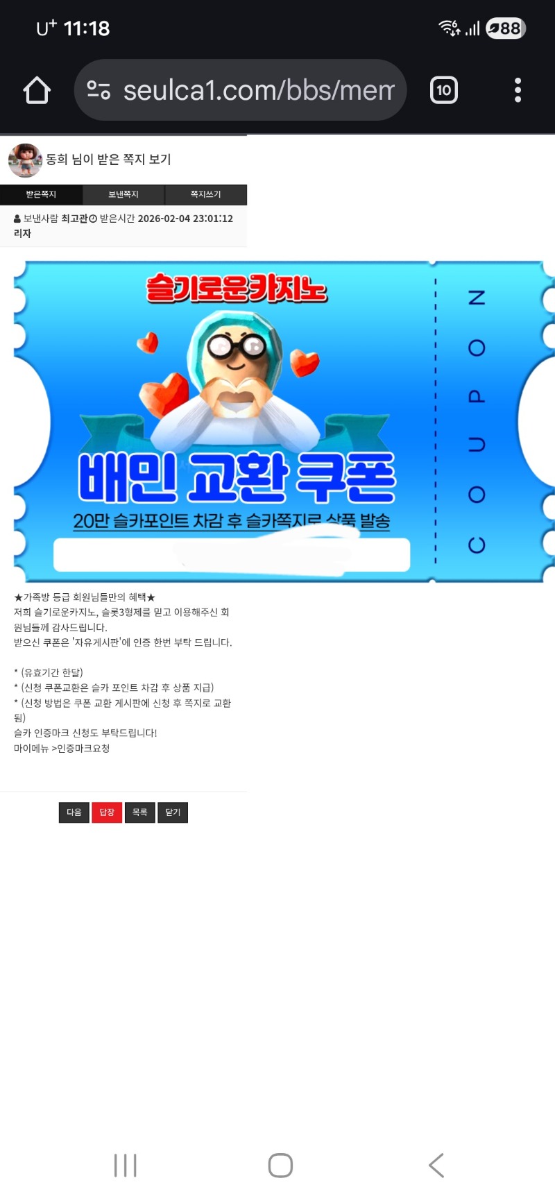 가족방.배민쿠폰 감사합니다. 동희 2 0 0 02.05 08:17 *기프티콘 바코드 노출 주의* <- 0 0 https://seulca1.com/bbs/board.php?bo_table=free&wr_id=3551906 Author 4 1 Lv.15 동희 15 43,659,437 (68%) 동희님 보유 포인트 : P 8,928,417 +2 02.08 모두 좋은아침 입니다 +2 02.07 모두 맛점들 하세요 +6 02.07 모두 좋은아침 입니다 +2 02.06 모두 좋은아침 입니다 +2 02.05 가족방.배민쿠폰 감사합니다.