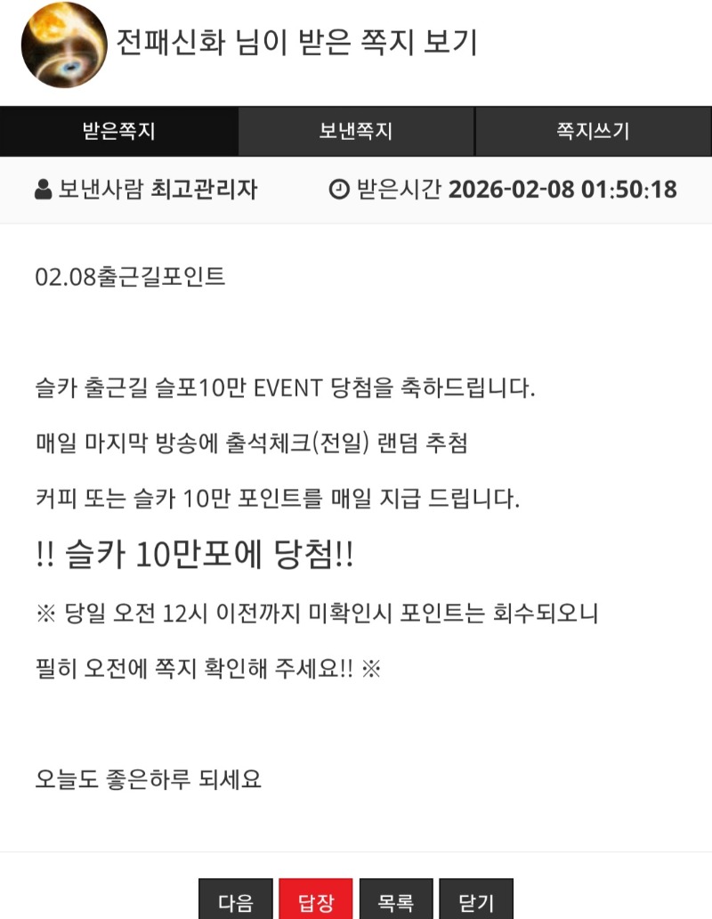 출근길 슬포 당첨!! 전패신화 5 0 0 09:51:45 *기프티콘 바코드 노출 주의* <- 감사합니다 ~ 0 0 https://seulca1.com/bbs/board.php?bo_table=free&wr_id=3561497 Author 0 1 Lv.14 전패신화 14 28,988,494 (85%) 전패신화님 보유 포인트 : P 119,162 +1 02.08 [비밀글] 쿠폰 교환 신청 +1 02.08 [비밀글] 포인트 교환 신청 +2 02.08 로또까지 망~남은거 최바비라도ㅋ!! +1 02.08 날씨 많이 춥네요 ~ +5 02.08 출근길 슬포 당첨!!