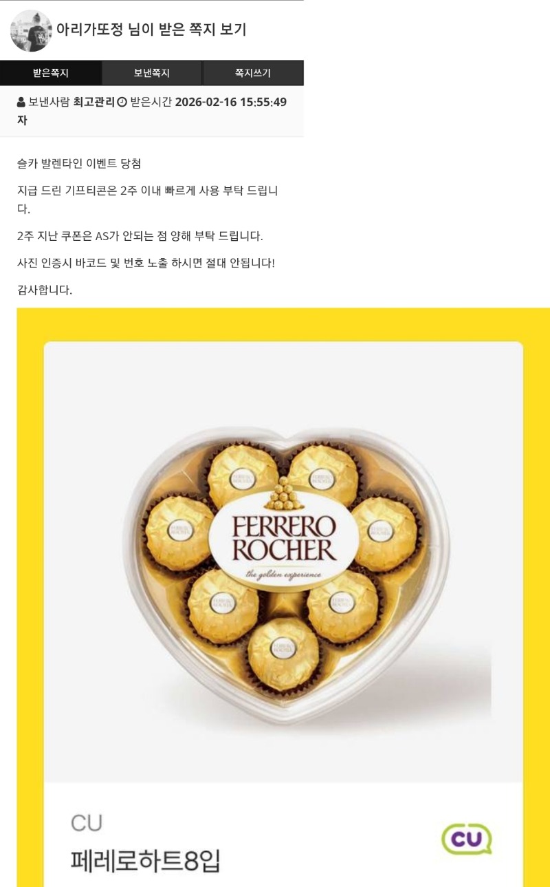 발렌타인선물감사합니다 아리가또정 0 0 0 02.16 15:57 *기프티콘 바코드 노출 주의* <- 0 0 https://seulca1.com/bbs/board.php?bo_table=free&wr_id=3589790 Author 4 2 Lv.12 아리가또정 12 17,231,788 (84%) 아리가또정님 보유 포인트 : P 14,021,696 +25 02.28 몇일전스포츠당첨 +19 02.28 만근신청합니다 02.16 발렌타인선물감사합니다 02.14 발렌타인인증 +3 02.11 미니형난치킨
