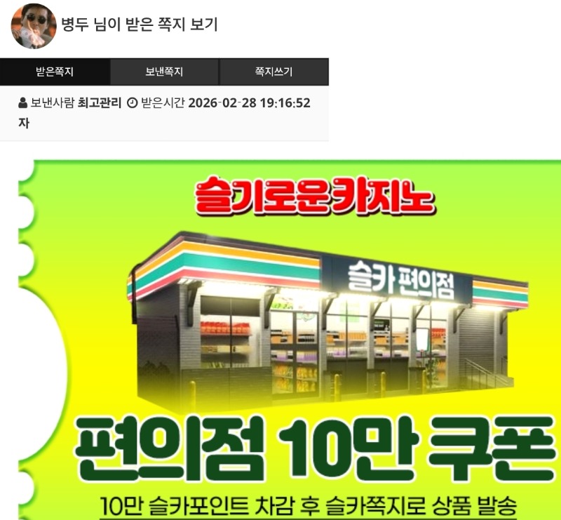 간만에 물개형 추겜 성공~ 병두 3 0 0 02.28 19:21 *기프티콘 바코드 노출 주의* <- 편쿱까지 나이챠!!!! 감사합니다 물개형 ㅎㅎ 0 0 https://seulca1.com/bbs/board.php?bo_table=free&wr_id=3630333 Author 2 0 Lv.12 병두 12 15,419,110 (48%) 병두님 보유 포인트 : P 11,347 +15 03.01 플레이어 한방에 패 +1 03.01 점메추 +1 02.28 [비밀글] 쿠폰교환신청 +3 02.28 간만에 물개형 추겜 성공~ +17 02.28 만근신청합니다