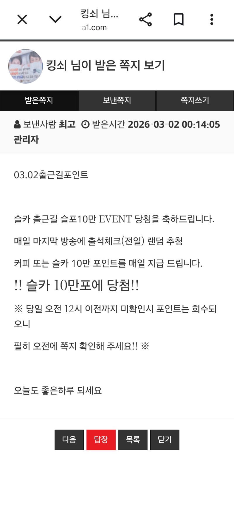 출근길10만포 당첨 킹쇠 5 0 0 03.02 03:08 *기프티콘 바코드 노출 주의* <- 0 0 https://seulca1.com/bbs/board.php?bo_table=free&wr_id=3635537 Author 3 0 Lv.13 킹쇠 13 21,857,868 (77%) 킹쇠님 보유 포인트 : P 18,564 +2 03.02 일복2등 +5 03.02 출근길10만포 당첨 03.02 출석 +20 03.01 정근신청 +23 02.26 멀린 768