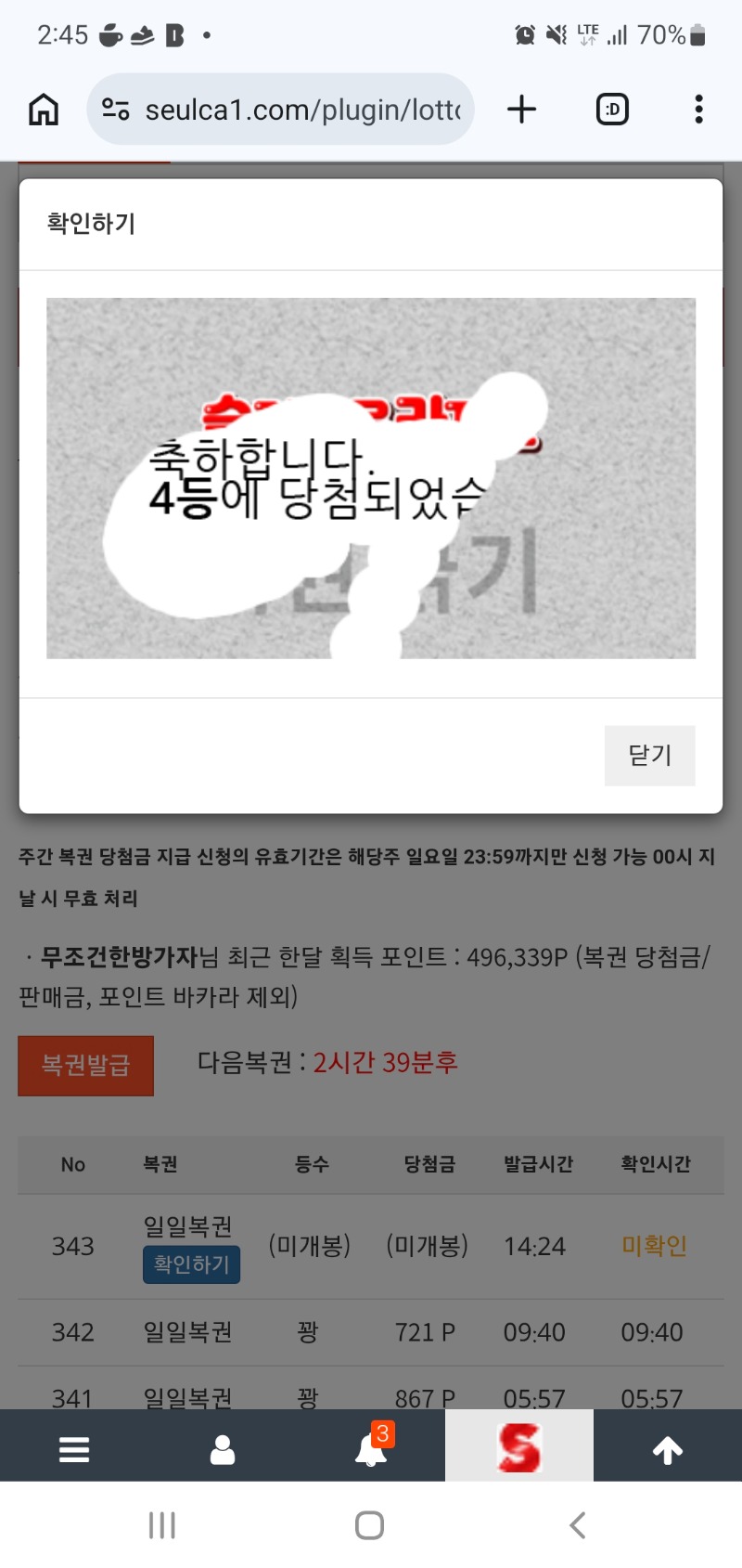 오랜만에 일복이가 4등을.. 무조건한방가자 25 1 0 03.02 14:45 *기프티콘 바코드 노출 주의* <- 겨우겨우주는듯요.. 1 0 https://seulca1.com/bbs/board.php?bo_table=free&wr_id=3636799 Author 0 0 Lv.7 무조건한방가자 7 2,838,404 (83%) 무조건한방가자님 보유 포인트 : P 2,000 +2 03.03 아..어제 우루스에서..900개 날려묵고.. +4 03.03 아침첫복권.. 03.03 다들출석하자구요~~ +2 03.02 금일 마지막복권.. 03.02 다시시작인강..
