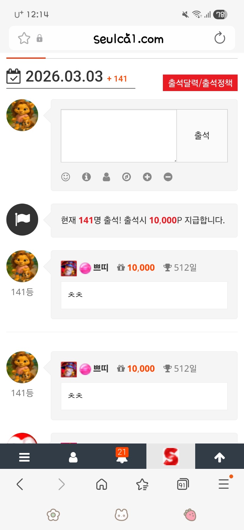 출첵 쁘띠 0 0 0 00:15:06 *기프티콘 바코드 노출 주의* <- 0 0 https://seulca1.com/bbs/board.php?bo_table=free&wr_id=3638686 Author 15 4 Lv.17 쁘띠 17 77,519,152 (25%) 쁘띠님 보유 포인트 : P 757,964 +2 03.03 아침 복권 꽝 +8 03.03 쌍복~~!!! +6 03.03 일복 10등 03.03 출첵 +2 03.02 저녁 복권 꽝