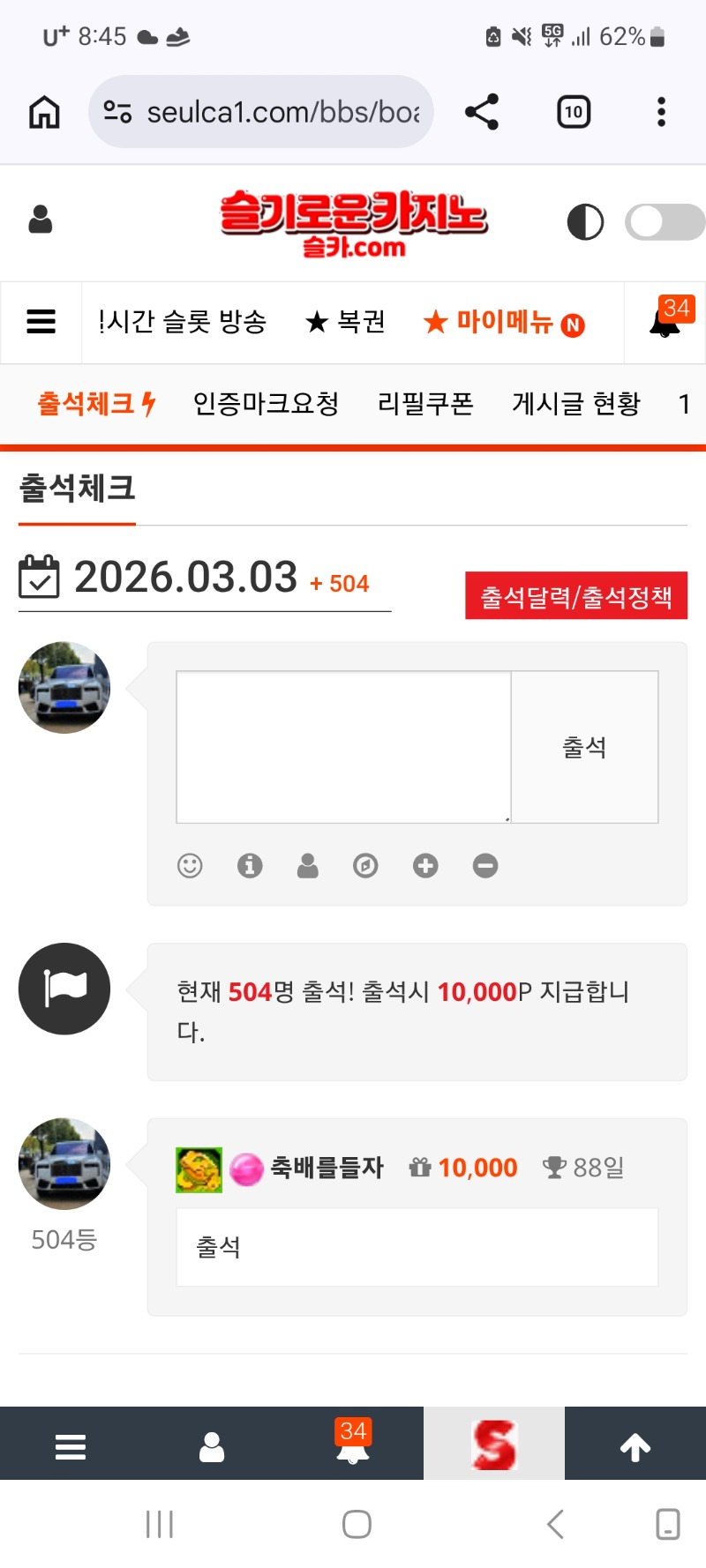 출석합니다 축배를들자 2 0 0 08:46:05 *기프티콘 바코드 노출 주의* <- 출석 0 0 https://seulca1.com/bbs/board.php?bo_table=free&wr_id=3639499 Author 2 0 Lv.12 축배를들자 12 15,050,402 (41%) 축배를들자님 보유 포인트 : P 669,649 +3 03.03 또 뱅으로 먹으면 아침일당 끝 +2 03.03 뱅으로간다 내꼬 내놔 +2 03.03 모닝 카라 플 가볍게 ㅡㅡ +2 03.03 모닝복권은 꽝ㅡㅡ +1 03.03 굿모닝입니다