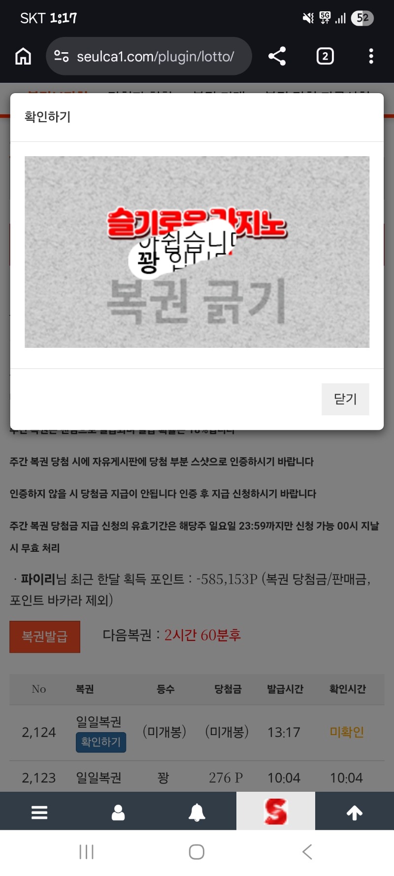 점심복권 꽝이옹 파이리 2 0 0 13:18:15 *기프티콘 바코드 노출 주의* <- 0 0 https://seulca1.com/bbs/board.php?bo_table=free&wr_id=3640202 Author 2 1 Lv.12 파이리 12 16,715,340 (74%) 파이리님 보유 포인트 : P 0 +3 03.03 리필완료...깡치기작업.. +2 03.03 점심복권 꽝이옹 +2 03.03 복권 꽝~ +6 03.03 모닝복권꽝 ㅠ +4 03.03 출첵!