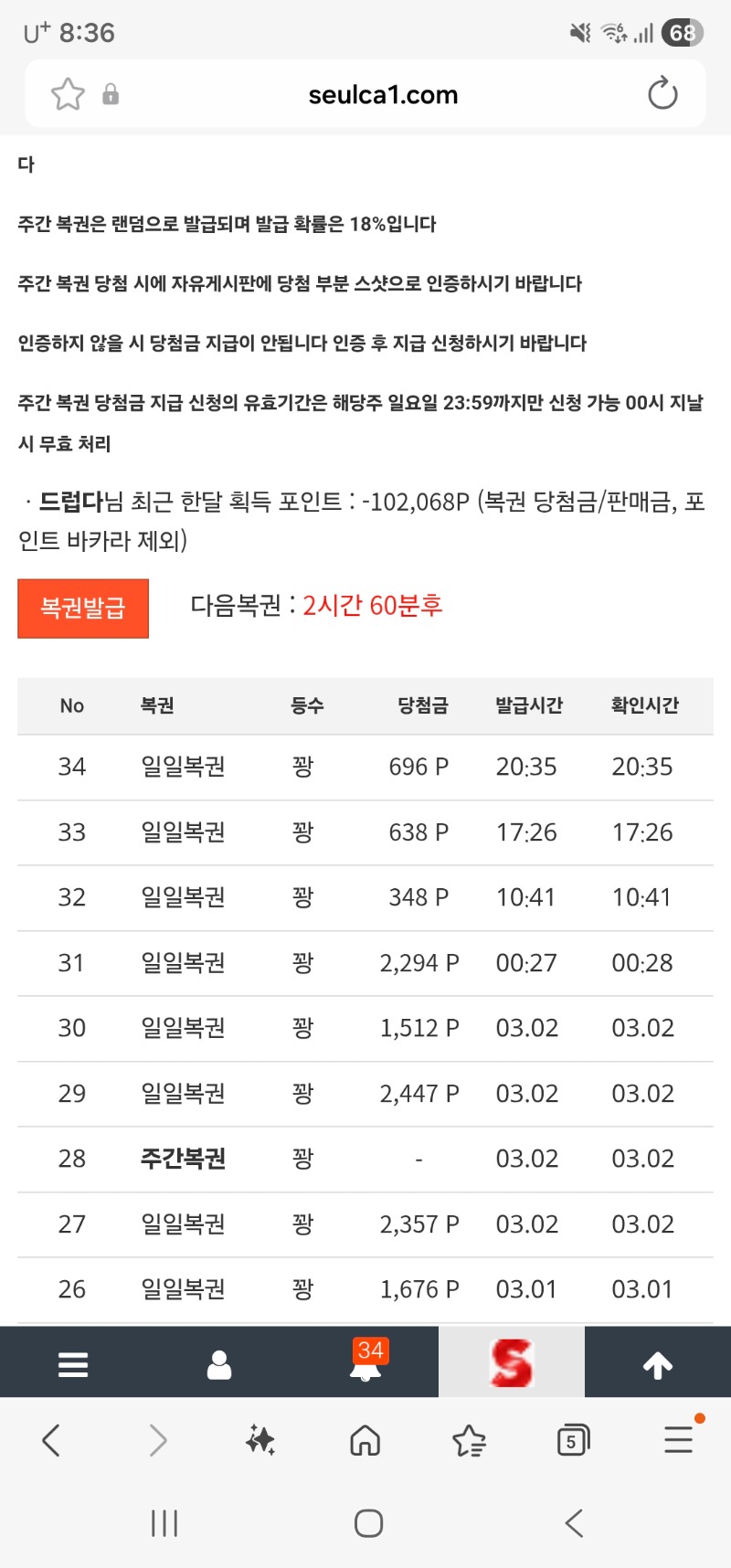 복 9연 꽝중 ㅜㅜ 드럽다 1 0 0 03.03 20:36 *기프티콘 바코드 노출 주의* <- 0 0 https://seulca1.com/bbs/board.php?bo_table=free&wr_id=3641748 Author 0 0 Lv.5 드럽다 5 771,093 (61%) 드럽다님 보유 포인트 : P 150,240 +9 03.16 닭집355배 +49 03.16 가토슈스케10023배 +1 03.03 복 9연 꽝중 ㅜㅜ +1 03.03 8연꽝중 ㅜㅜ +2 03.03 7연꽝중 ㅜㅜ