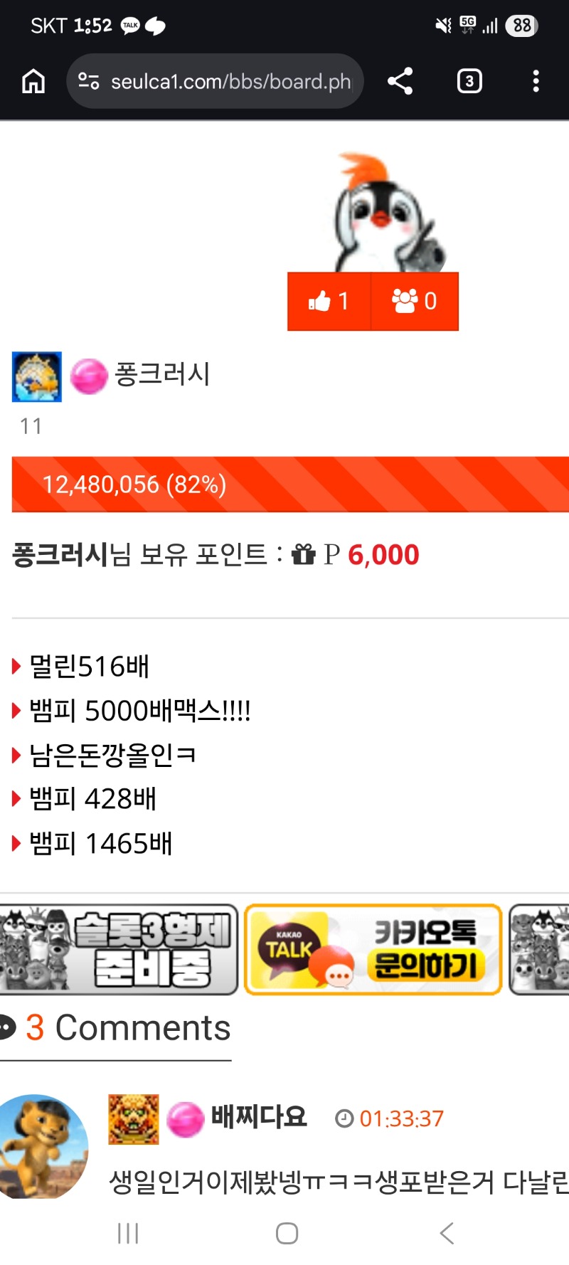 새벽 슬카라 요주인물 3인. 파이리 24 0 0 03.05 13:55 *기프티콘 바코드 노출 주의* <- 겨란마으리님 생존하셨습니다. 0 0 https://seulca1.com/bbs/board.php?bo_table=free&wr_id=3647998 Author 3 1 Lv.13 파이리 13 20,000,141 (40%) 파이리님 보유 포인트 : P 2,273,891 +3 04.15 오전 스포츠도 나가리.. 슬롯도 나가리 ㅋㅋㅋ +1 04.15 출첵커피 감사합니다 +4 04.15 오전 미야,미축 오버도전!! +4 04.15 시안데이 후기 +21 04.15 핫피 213배*2100