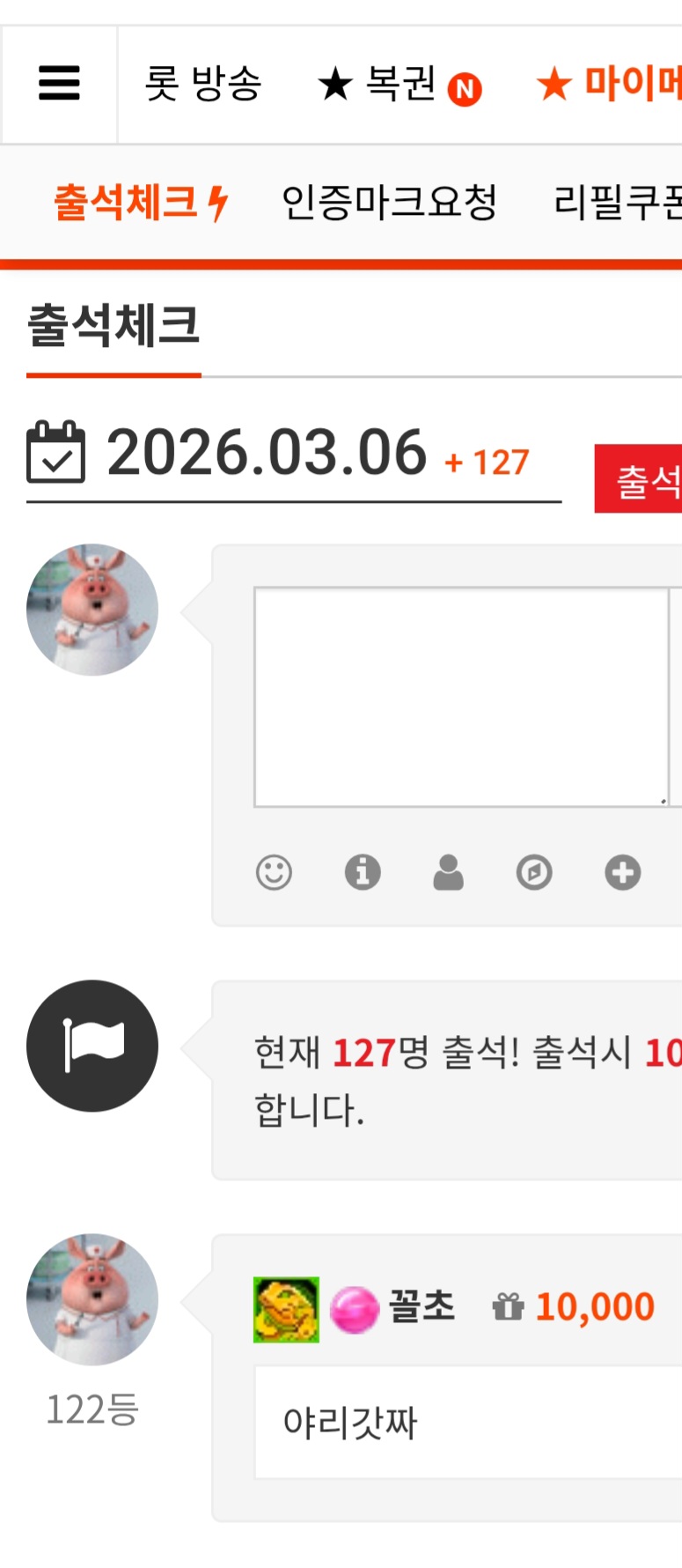 출첵완료 꼴초 0 0 0 03.06 00:07 *기프티콘 바코드 노출 주의* <- 0 0 https://seulca1.com/bbs/board.php?bo_table=free&wr_id=3650057 Author 1 0 Lv.13 꼴초 13 21,555,602 (71%) 꼴초님 보유 포인트 : P 1,697,422 04.16 굿모닝요 +6 04.15 깜짝선물? +7 04.15 최배비 돈이형 1등 ㅅㅅ +2 04.15 일복꽝 +5 04.15 굿모닝입니다~~