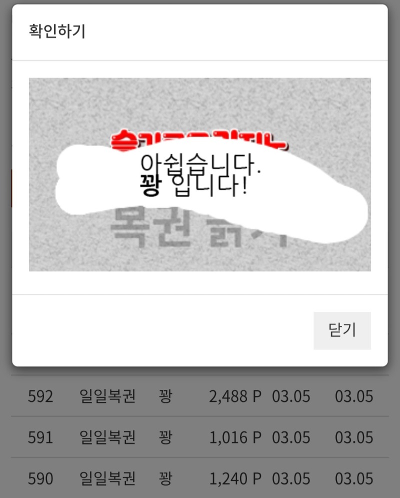 또첫복권꽝 꼴초 0 0 0 03.06 00:08 *기프티콘 바코드 노출 주의* <- 0 0 https://seulca1.com/bbs/board.php?bo_table=free&wr_id=3650067 Author 1 0 Lv.13 꼴초 13 21,553,802 (71%) 꼴초님 보유 포인트 : P 1,695,622 04.16 굿모닝요 +6 04.15 깜짝선물? +7 04.15 최배비 돈이형 1등 ㅅㅅ +2 04.15 일복꽝 +5 04.15 굿모닝입니다~~