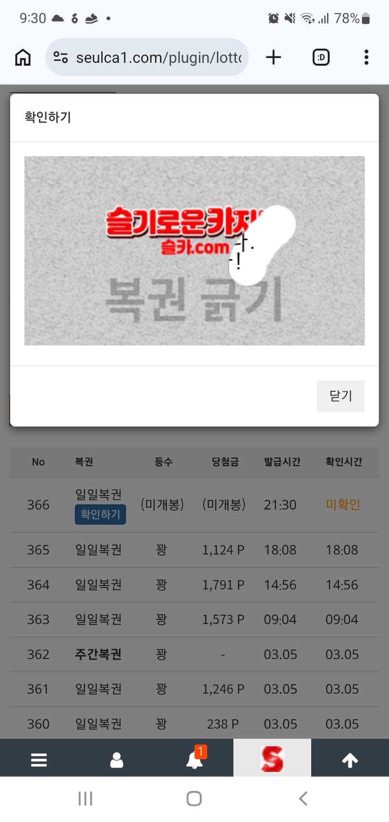 금요일마지막복권.. 무조건한방가자 1 0 0 03.06 21:31 *기프티콘 바코드 노출 주의* <- 마지막복권이도 역시.. 0 0 https://seulca1.com/bbs/board.php?bo_table=free&wr_id=3653118 Author 0 0 Lv.7 무조건한방가자 7 2,971,815 (97%) 무조건한방가자님 보유 포인트 : P 3,451 +2 03.07 점심먹고 복첵! +2 03.07 모닝복이 +1 03.06 금요일마지막복권.. +6 03.06 점심 복이.. +8 03.06 모닝복이는요