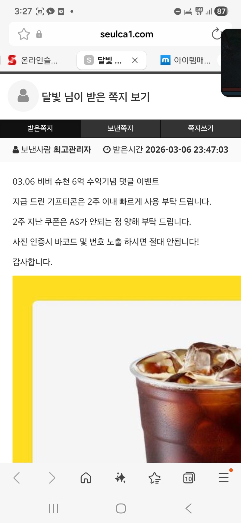 수익커피 감사 달빛 3 0 0 06:32:10 *기프티콘 바코드 노출 주의* <- 0 0 https://seulca1.com/bbs/board.php?bo_table=free&wr_id=3654246 Author 0 1 Lv.12 달빛 12 13,129,976 (2%) 달빛님 보유 포인트 : P 2,455,881 +6 03.07 출근길 포인트100만년만에 ㄱㅅ +3 03.07 수익커피 감사 03.06 수익왕 129배 ㅡ.ㅡ +2 03.06 불금 다들 존 주말보내셔유 +2 03.06 복권은 역시 꽝.. 그래서 복권인겨..