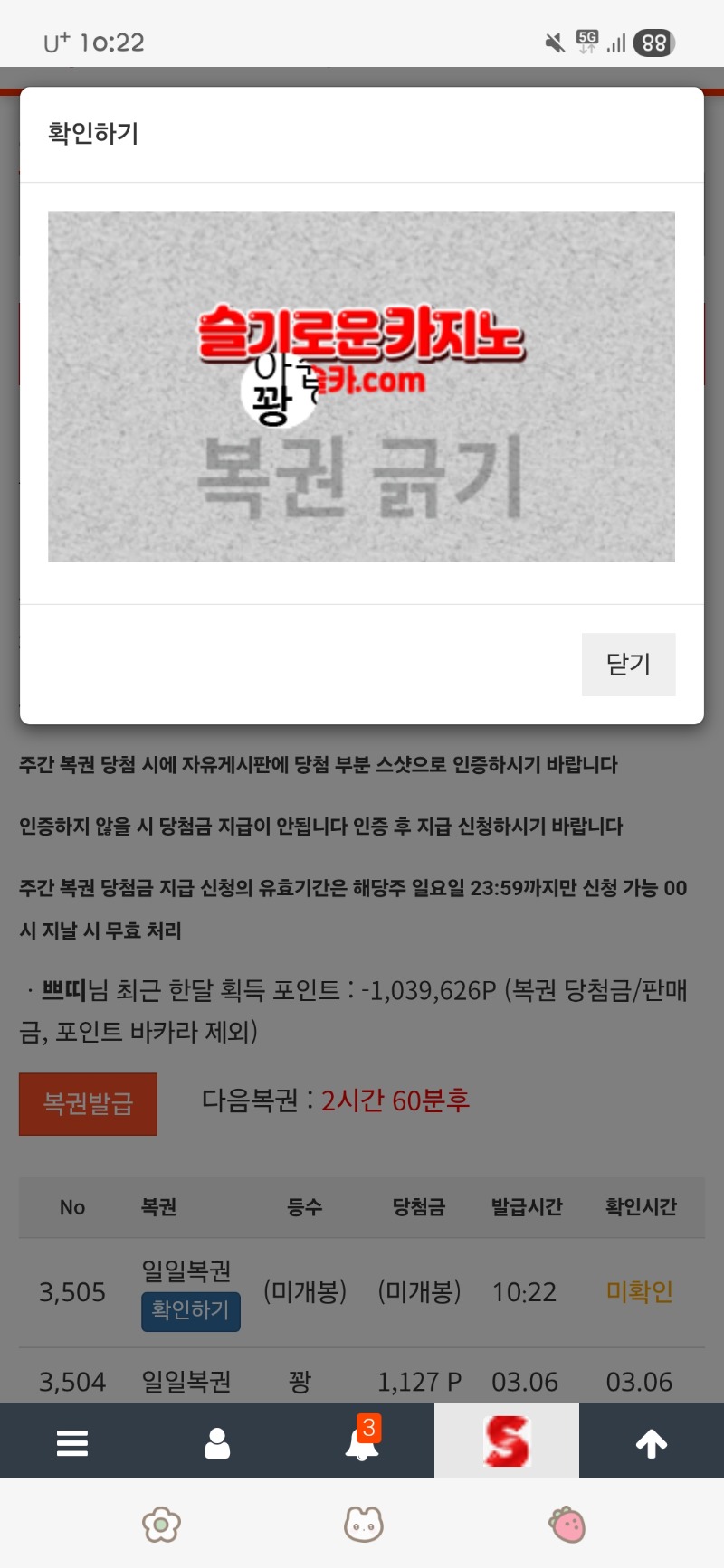 아침 복권 꽝 쁘띠 2 0 0 10:23:34 *기프티콘 바코드 노출 주의* <- 0 0 https://seulca1.com/bbs/board.php?bo_table=free&wr_id=3654790 Author 16 4 Lv.17 쁘띠 17 77,692,413 (25%) 쁘띠님 보유 포인트 : P 819,413 +2 03.07 아침 복권 꽝 +4 03.07 비버~~수익 커피~~~ +5 03.07 출첵 +2 03.06 계속 꽝~ +10 03.06 어제 과음~~국빕으로 해장~