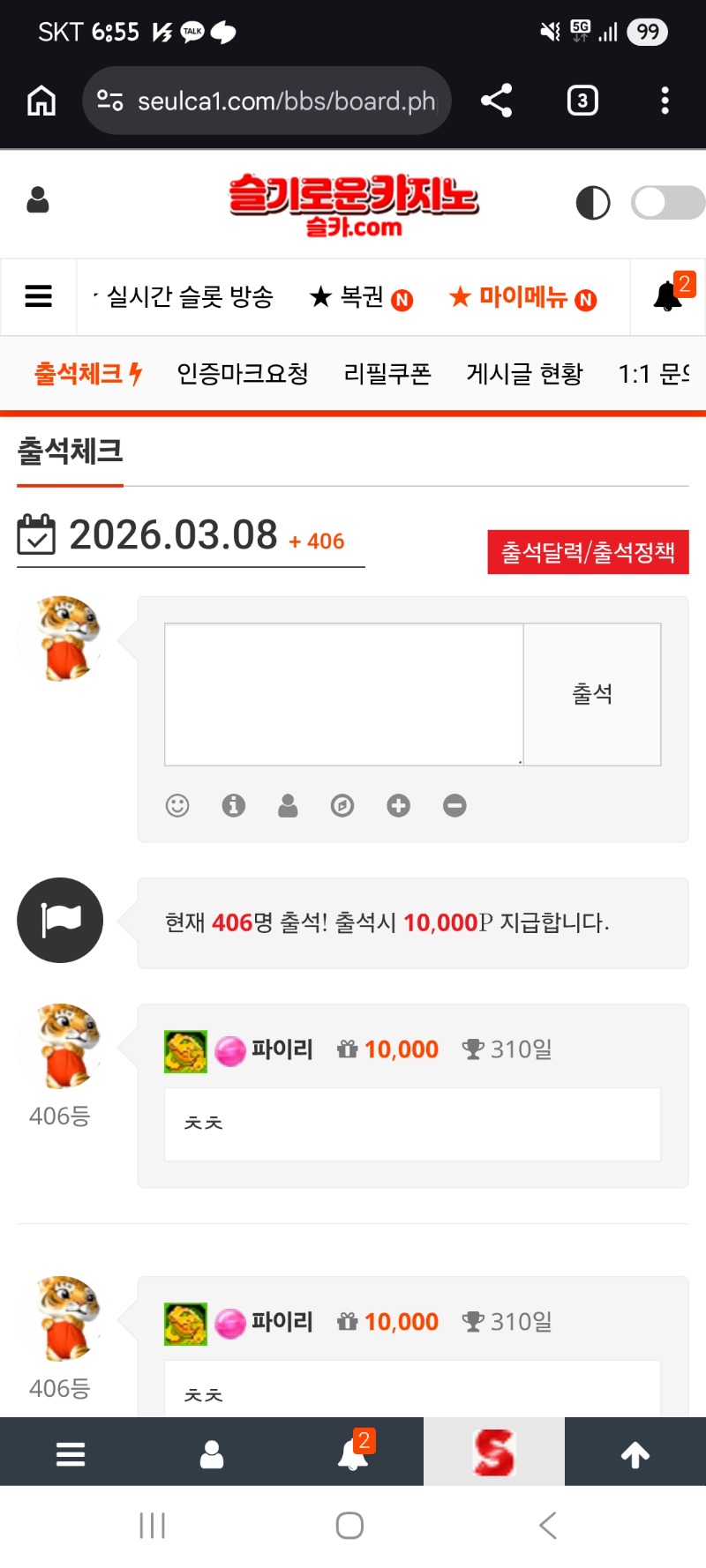 오늘도 출첵... 파이리 0 0 0 06:55:46 *기프티콘 바코드 노출 주의* <- 0 0 https://seulca1.com/bbs/board.php?bo_table=free&wr_id=3658339 Author 2 1 Lv.12 파이리 12 17,028,833 (80%) 파이리님 보유 포인트 : P 23,253 03.08 모닝 복권 꽝~~~ 03.08 오늘도 출첵... +6 03.07 리필완료 ! +11 03.07 네 그렇습니다 꽝이네요 ㅎ +6 03.07 이모~