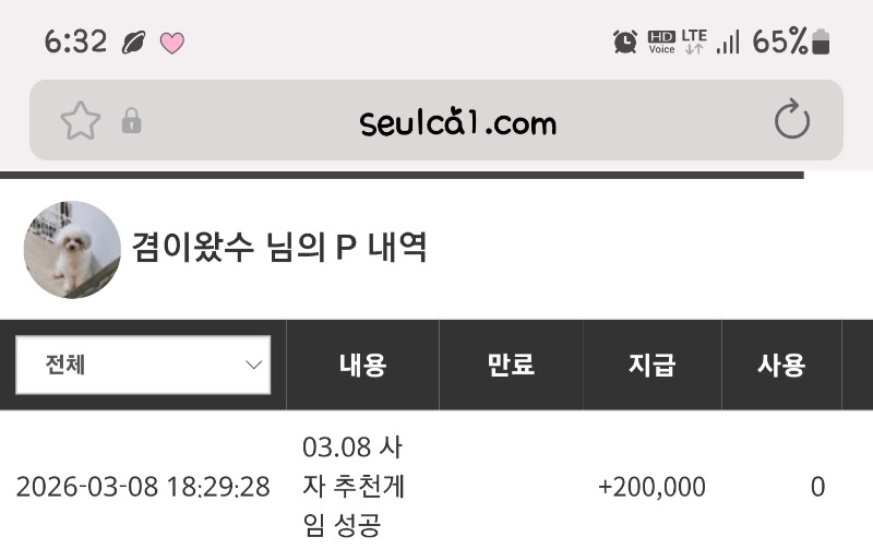 사자형 추겜성공및비쿱 겸이왔수 5 0 0 18:33:41 *기프티콘 바코드 노출 주의* <- 사자형 고맙습니다 다행이 슈슈에서 나이스샷 사자 0 0 https://seulca1.com/bbs/board.php?bo_table=free&wr_id=3661302 Author 2 0 Lv.11 겸이왔수 11 10,705,475 (23%) 겸이왔수님 보유 포인트 : P 1,153 +5 03.08 사자형 추겜성공및비쿱 +4 03.08 촤바비 사자형 1등가즈아앗 03.08 출췍!! +1 03.07 내일 촤바비를 위해 리필 03.07 로또 당첨 축하드립니다