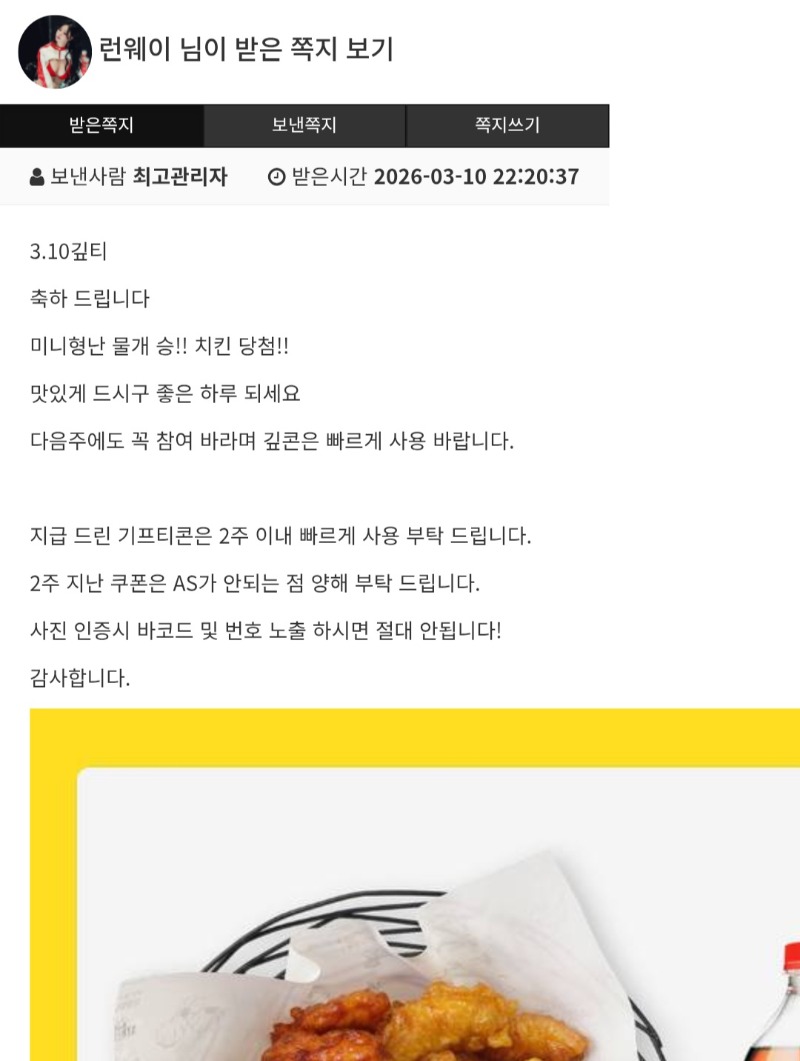 미형 치키니 당첨! 런웨이 3 0 0 22:31:32 *기프티콘 바코드 노출 주의* <- 감사합니다 잘 먹을게요 ㅎ 0 0 https://seulca1.com/bbs/board.php?bo_table=free&wr_id=3669986 Author 0 0 Lv.13 런웨이 13 18,397,165 (7%) 런웨이님 보유 포인트 : P 7,143 +3 03.10 미형 치키니 당첨! +3 03.10 리필신청 +34 03.10 슈슈 334 +33 03.10 뱀피 120 +1 03.09 저녁 리필 주세요