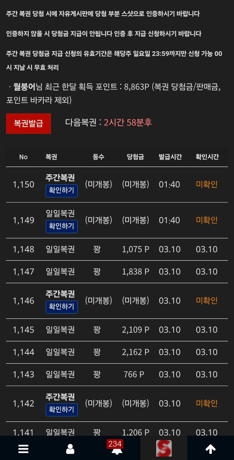 쌍복... 월붕어 0 0 0 01:43:39 *기프티콘 바코드 노출 주의* <- 0 0 https://seulca1.com/bbs/board.php?bo_table=free&wr_id=3670542 Author 0 0 Lv.9 월붕어 9 6,475,701 (61%) 월붕어님 보유 포인트 : P 3,907,819 03.11 쌍복... 03.11 출석 +6 03.10 노리밋 지옥으로가는고속도로 304배 +12 03.10 노리밋 덕헌터스 365배 +13 03.10 노리밋 아웃소싱 1249배