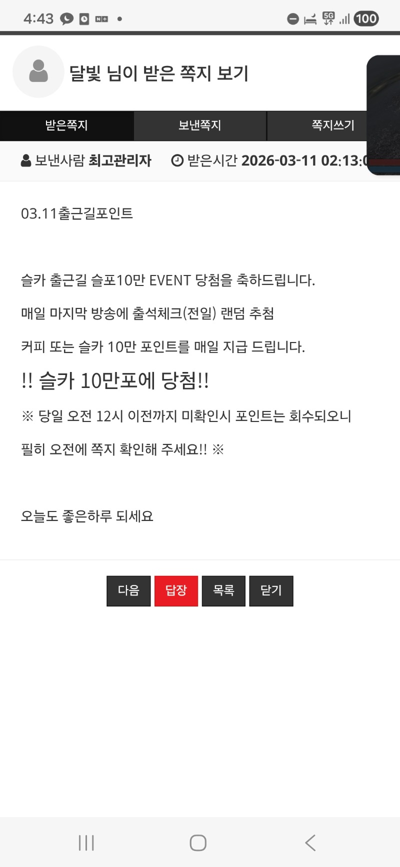 출근길 포인트 ㄱㅅ 달빛 3 0 0 07:14:50 *기프티콘 바코드 노출 주의* <- 0 0 https://seulca1.com/bbs/board.php?bo_table=free&wr_id=3670846 Author 0 1 Lv.12 달빛 12 13,252,372 (5%) 달빛님 보유 포인트 : P 1,072,059 +3 03.11 출근길 포인트 ㄱㅅ +4 03.10 형난포 ㄱㅅ 03.10 시안 형난 이벤 참여~ +11 03.10 건담 861배. +30 03.10 멀린 778배 ㅡㅡ 젠장