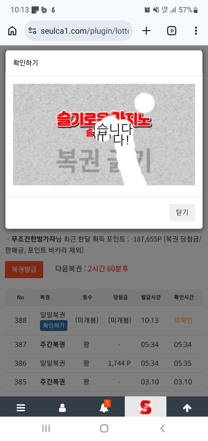 오전복첵 무조건한방가자 0 0 0 10:14:19 *기프티콘 바코드 노출 주의* <- 100꽝을 위한 순항중.. 0 0 https://seulca1.com/bbs/board.php?bo_table=free&wr_id=3671145 Author 0 0 Lv.8 무조건한방가자 8 3,121,166 (12%) 무조건한방가자님 보유 포인트 : P 26,104 03.11 오전복첵 +2 03.11 왠일로 쌍복이를 또주나했으나 +4 03.10 오랜만에 쌍복인데 +2 03.10 시안미형참완 +2 03.10 복췍..