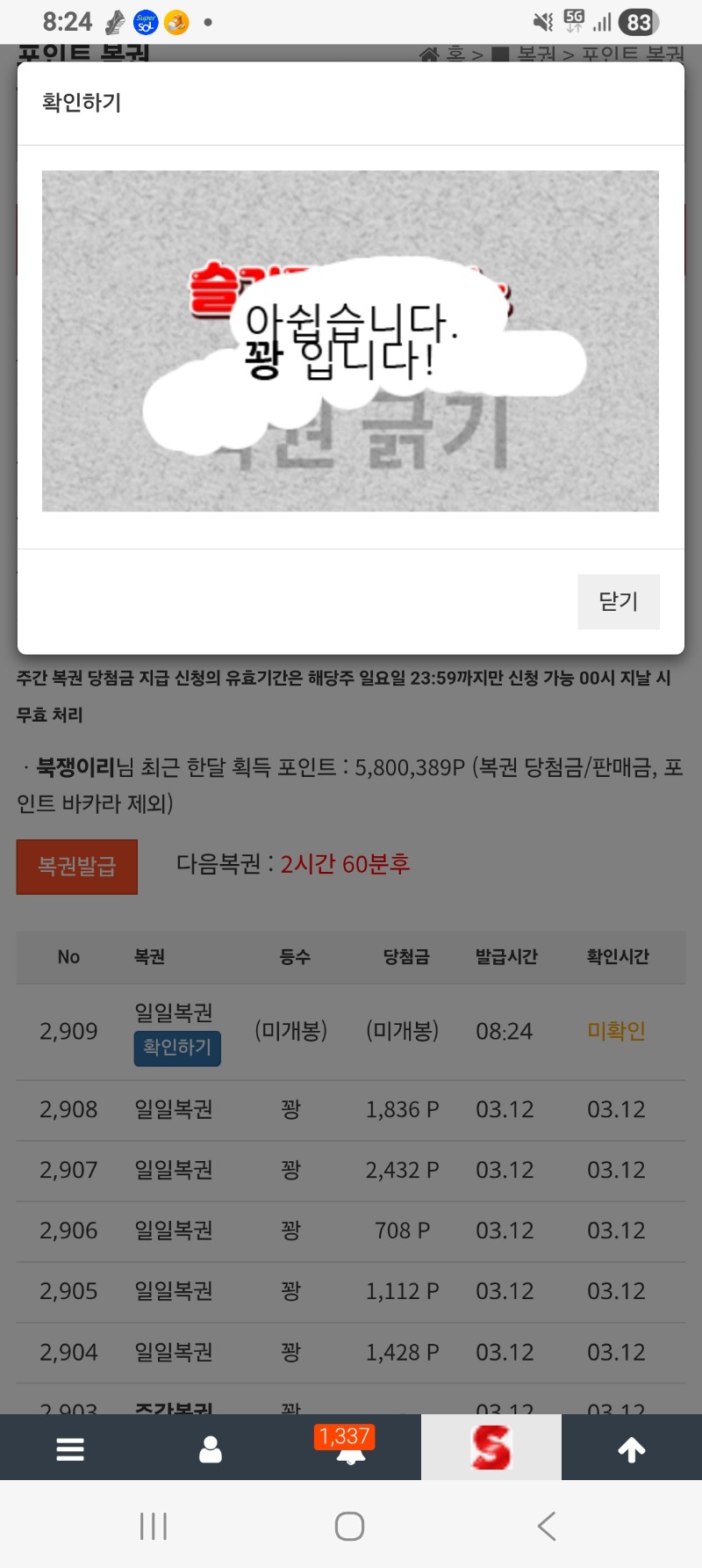 모닝복권 북쟁이리 4 0 0 08:25:32 *기프티콘 바코드 노출 주의* <- 꽝. 0 0 https://seulca1.com/bbs/board.php?bo_table=free&wr_id=3676928 Author 4 3 Lv.14 북쟁이리 14 28,758,889 (82%) 북쟁이리님 보유 포인트 : P 0 +2 03.13 이모소환 +3 03.13 출첵 +4 03.13 모닝복권 03.12 대물햄 주복 1등 축하드려요 +1 03.12 형난 베팅금 빼갔네.ㅎ